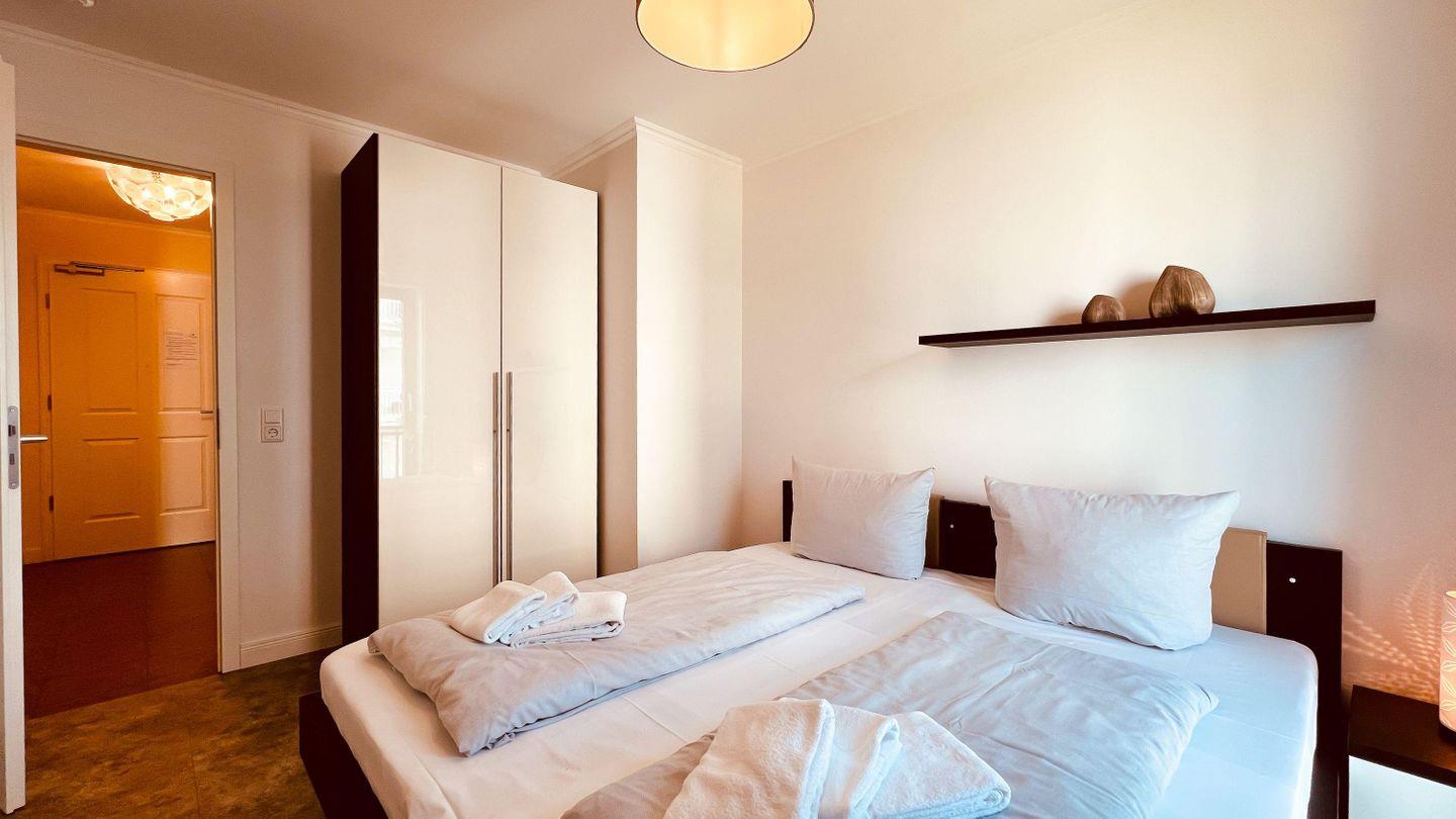 Mit einem großen Doppelbett (getrennte Matratzen) und einem hohen Kleiderschrank empfängt Sie einer der SCHLAFRÄUME. Das zweite Schlafzimmer ist mit zwei Einzelbetten (als Doppelbett hergerichtet/ getrennte Matratzen) und ebenfalls einem hohen Kleiderschrank eingerichtet. Das BADEZIMMER besticht mit einer ebenerdigen Dusche. Angrenzend befindet sich noch ein separates GÄSTE-WC. Auf den charmanten ECKBALKON (Süd-West-Ausrichtung) gelangen Sie durch den Wohnbereich. Von hier aus können Sie einen Blick auf die blaue Ostsee werfen. In allen Räumen sorgt eine Fußbodenheizung für gemütliche Wärme. In der Wohnung finden Sie noch eine zusätzliche Abstellgelegenheit für reichlich Stauraum.