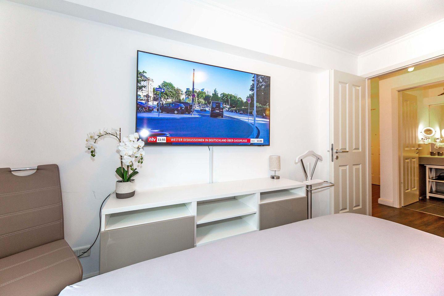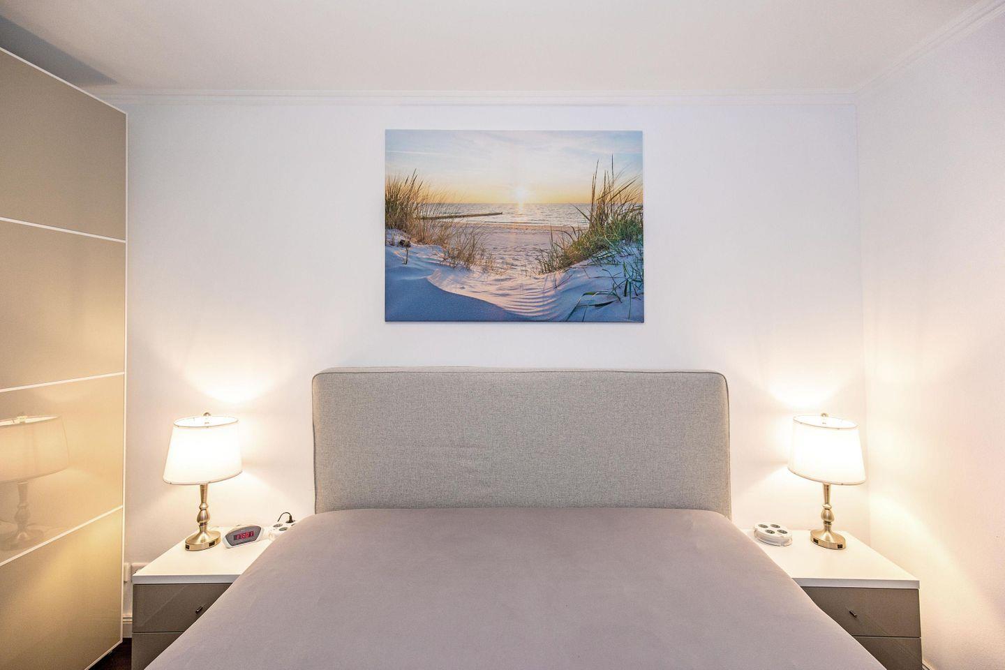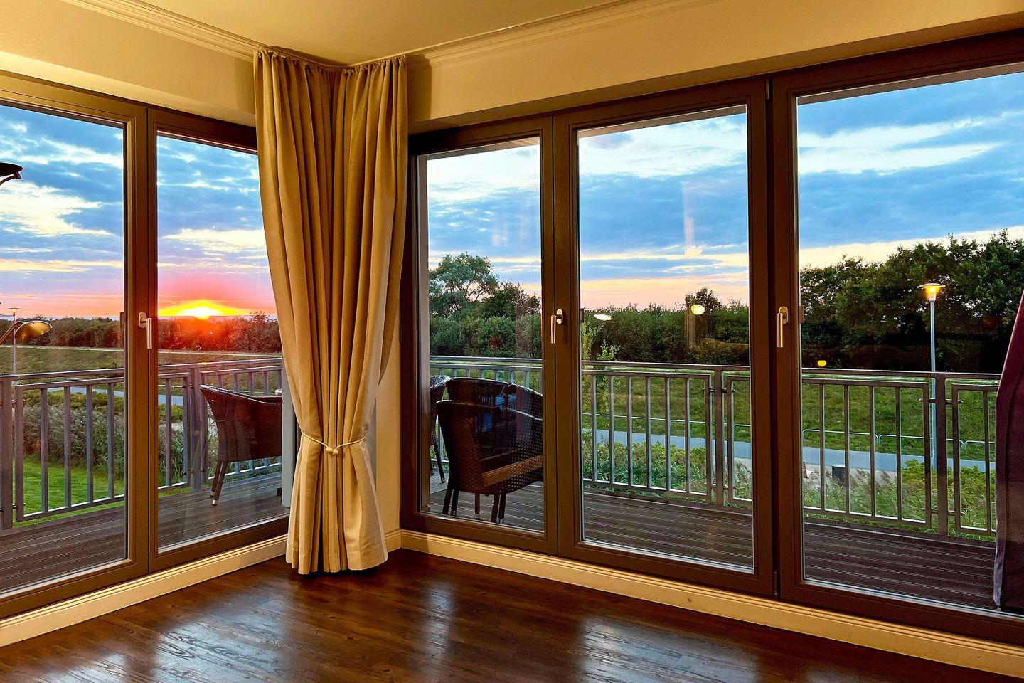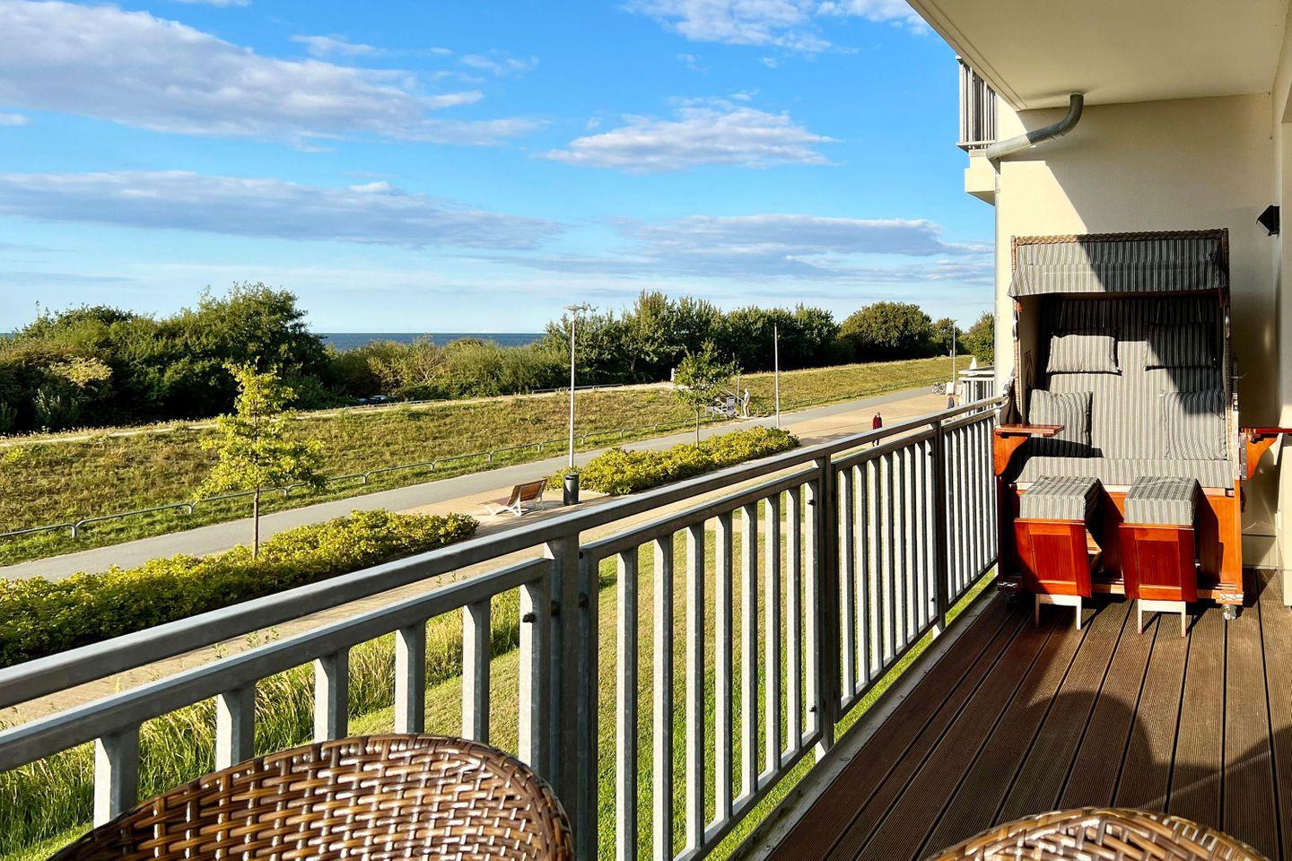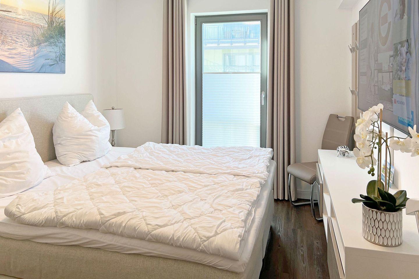 Über den Wohnbereich gelangen Sie auf den großen ECKBALKON in Nord-West-Ausrichtung mit traumhaftem Meerblick. Hier können Sie die Nachmittags- und Abendsonne und unvergessliche Sonnenuntergänge genießen. Der Balkon mit Tisch, Stühlen und einem stilechten Strandkorb ist auch bei schlechterem Wetter durch den darüberliegenden Vorbau gut geschützt. Ein modernes Boxspringbett mit durchgehender Matratze von 1,80 x 2,00 m. erwartet Sie im SCHLAFZIMMER. Ein zusätzlicher Topper, ein Kleiderschrank mit Ganzkörperspiegel und eine Wandkommode sowie ein moderner 65 Zoll TV darüber vervollständigen den Raum. BITTE BEACHTEN Sie, dass im Schlafzimmer kein Platz für ein zusätzliches Kinderreisebett vorhanden ist. An allen Fenstern sind blickdichte Vorhängen und Plissees vorhanden.