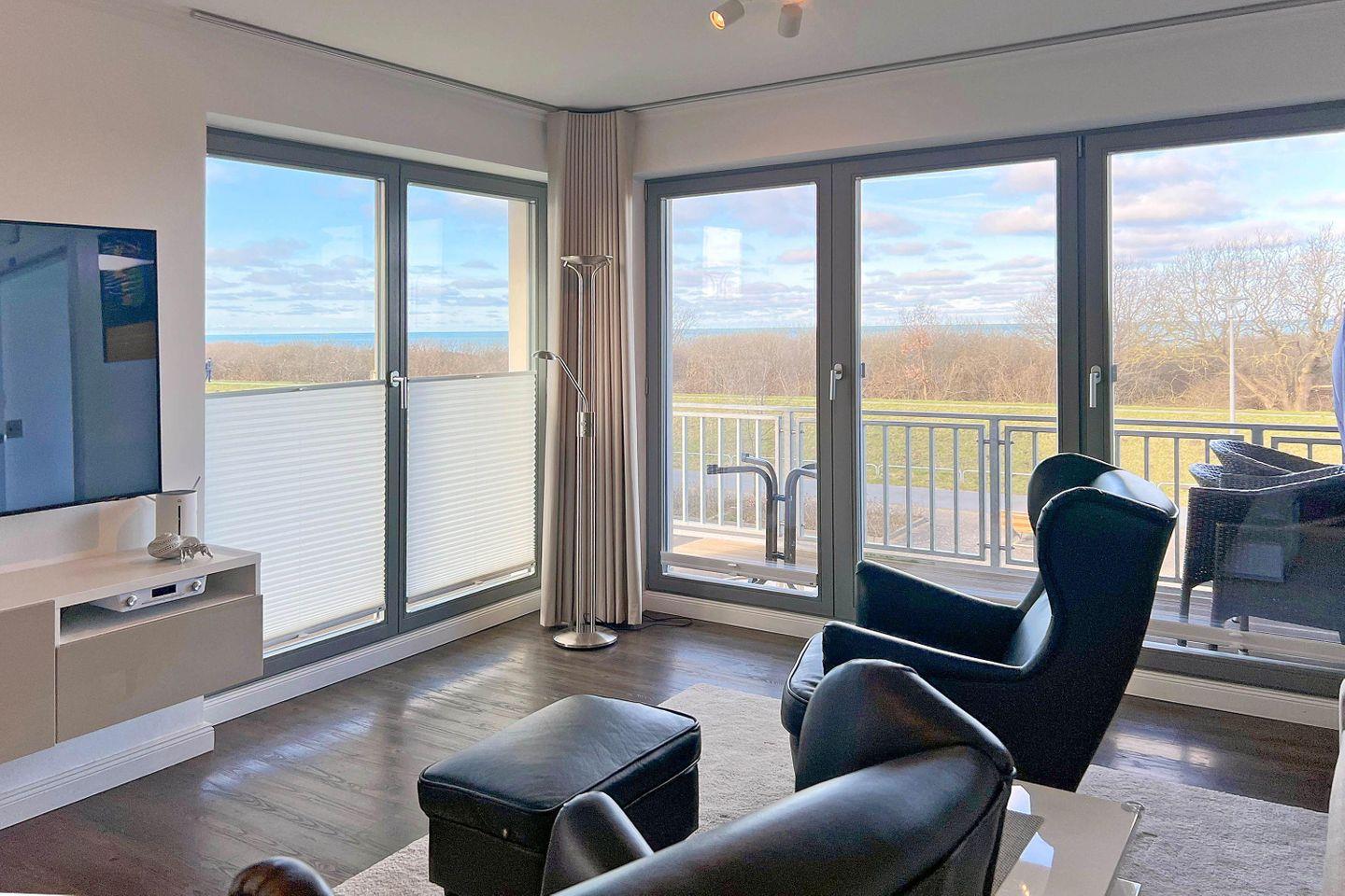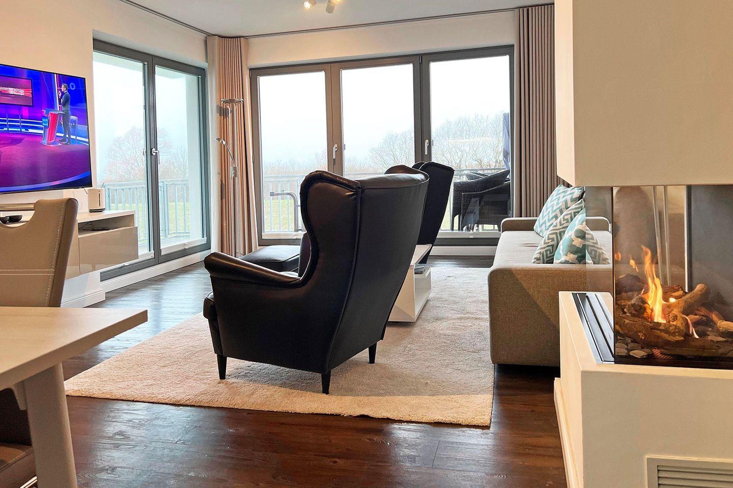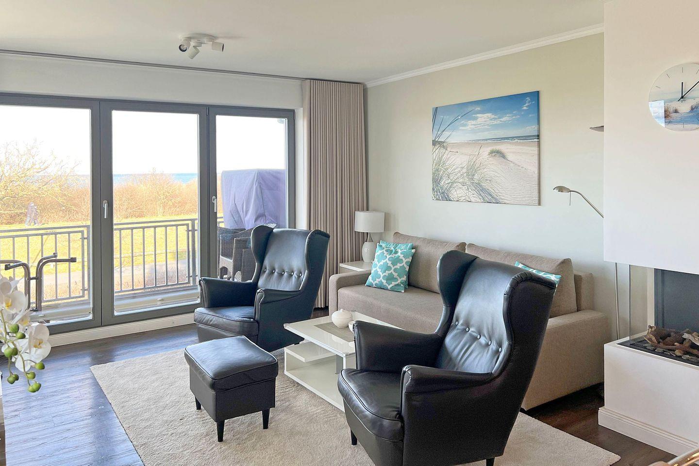 Die Ferienwohnung wurde im November 2022 neugestaltet. Im WOHNBEREICH empfangen Sie eine bequeme Sitzecke mit ausziehbarer Schlafcouch (1,40 x 2,00 m), ein TV-Board und als besonderes Highlight ein großer 65-Zoll-Fernseher mit Blu-ray-Player. Ein ganzer Schwung an DVDs und ein Radio-CD-Player mit der Möglichkeit über Bluetooth Musik vom Handy zu spielen. Das sorgt für gute Laune. Ein stilvoller gläserner GAS-KAMIN und dessen Flammenspiel wirken entschleunigend und zaubern stimmungsvolle Stunden. Die großzügige Fensterfront über Eck flutet den Raum mit Licht. Zudem erhascht man bereits von der Sitzecke aus, einen Blick auf die Ostsee. In der OFFENE EINBAUKÜCHE mit Backofen und 4-Platten-Ceranfeld, Geschirrspüler, Kühlschrank mit Gefrierfach, Mikrowelle, Kaffeemaschine, „Nespressomaschine“, Wasserkocher und Toaster lassen sich leckere Mahlzeiten zubereiten und am angrenzenden Esstisch mit vier ledernen Hochlehnern verzehren.