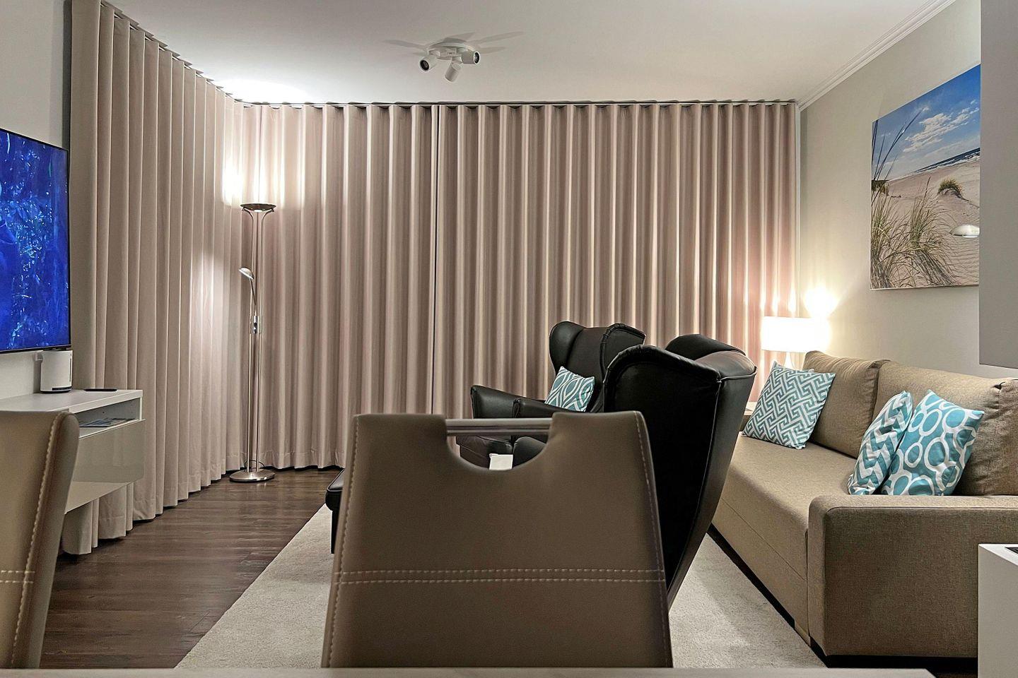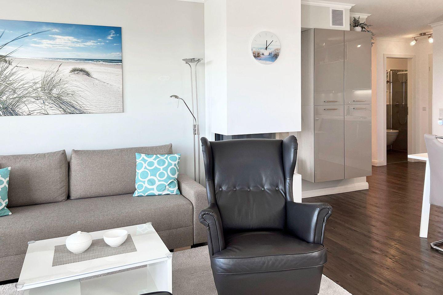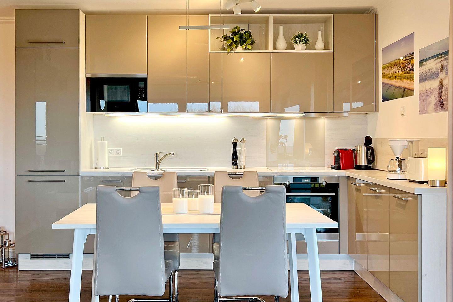 Die Ferienwohnung wurde im November 2022 neugestaltet. Im WOHNBEREICH empfangen Sie eine bequeme Sitzecke mit ausziehbarer Schlafcouch (1,40 x 2,00 m), ein TV-Board und als besonderes Highlight ein großer 65-Zoll-Fernseher mit Blu-ray-Player. Ein ganzer Schwung an DVDs und ein Radio-CD-Player mit der Möglichkeit über Bluetooth Musik vom Handy zu spielen. Das sorgt für gute Laune. Ein stilvoller gläserner GAS-KAMIN und dessen Flammenspiel wirken entschleunigend und zaubern stimmungsvolle Stunden. Die großzügige Fensterfront über Eck flutet den Raum mit Licht. Zudem erhascht man bereits von der Sitzecke aus, einen Blick auf die Ostsee. In der OFFENE EINBAUKÜCHE mit Backofen und 4-Platten-Ceranfeld, Geschirrspüler, Kühlschrank mit Gefrierfach, Mikrowelle, Kaffeemaschine, „Nespressomaschine“, Wasserkocher und Toaster lassen sich leckere Mahlzeiten zubereiten und am angrenzenden Esstisch mit vier ledernen Hochlehnern verzehren.