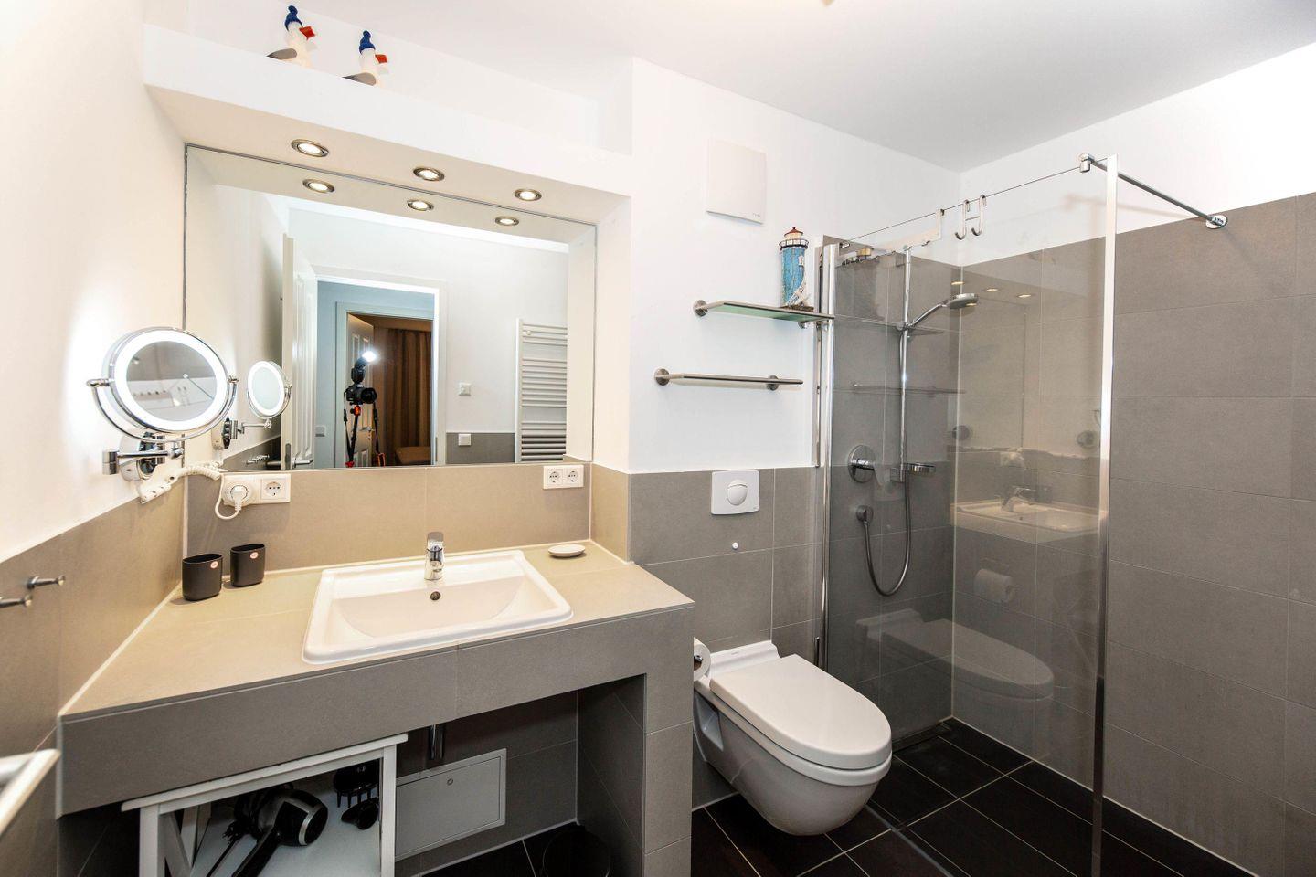 Das BADEZIMMER besticht mit bodentiefer Dusche, großem Spiegel, LED-Kosmetikwandspiegel, elektrischem Handtuchtrockner, Personenwaage, Föhn und mehreren Ablagemöglichkeiten. Ein kleiner Garderobenbereich am Eingang der Wohnung bietet dem Anlass entsprechend Platz für Jackett und Windjacke. Zusätzliche Dinge wie Ihre Koffer können Sie bequem im separaten Abstellraum unterbringen. In allen Räumen wurde eine Fußbodenheizung für angenehme und gleichmäßige Wärme eingebaut. Die Unterkunft liegt nur wenige Meter zum Strand entfernt und wird lediglich durch die gepflegte Promenade von den Dünen getrennt. Kein Autoverkehr!