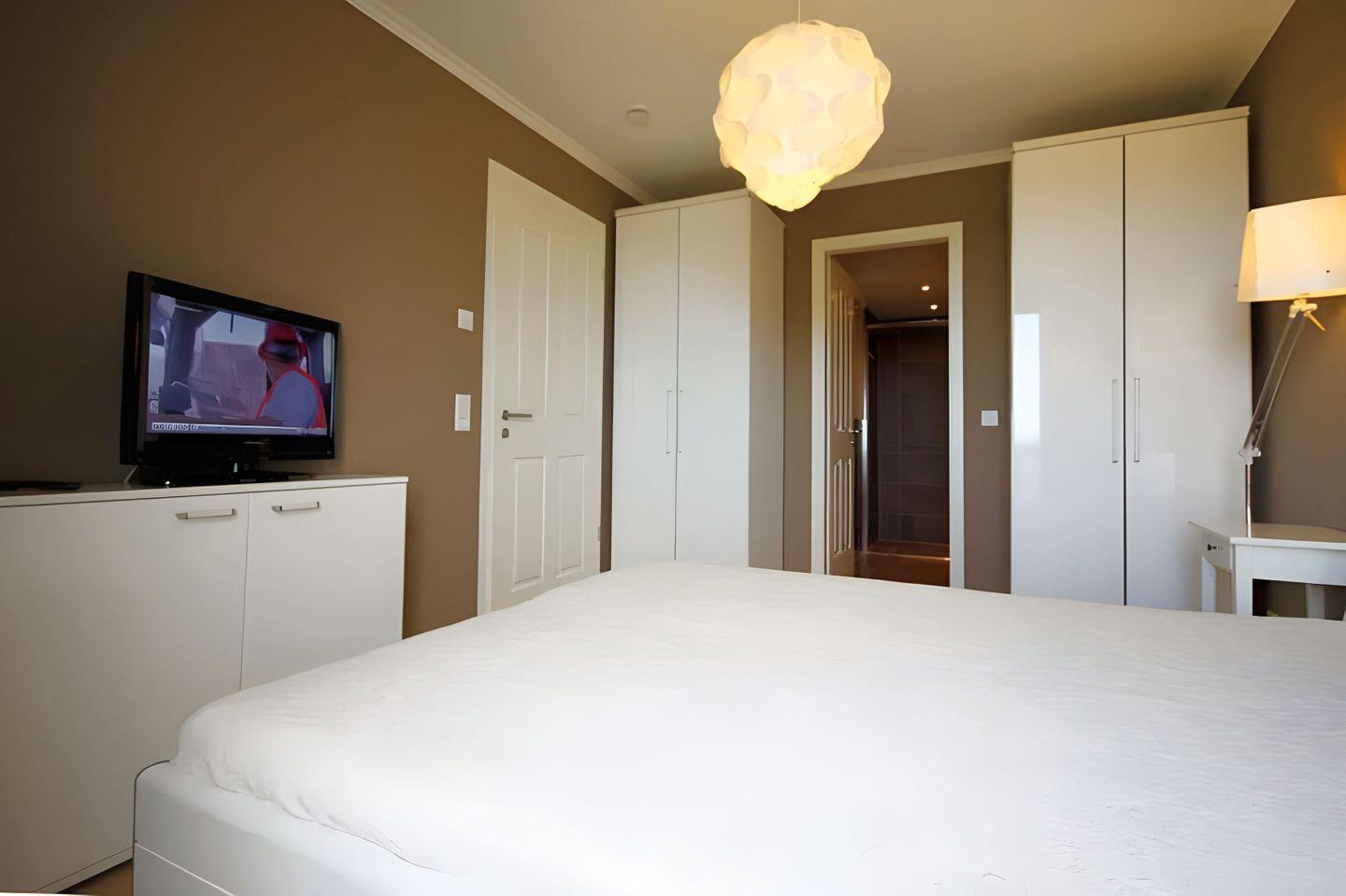 Der edle WOHNBEREICH empfängt Sie mit einer großen L-förmigen Couch, einem TV- Gerät, einem Radio und einem stilvollen Gas- Kamin. Angrenzend an die Kücheninsel befindet sich ein moderner Esstisch mit Stühlen und Sitzbank. Die hochwertige EINBAUKÜCHE ist mit Geschirrspüler, Kühlschrank, inklusive Gefrierfach, Kaffeemaschine, Wasserkocher, Toaster, Mikrowelle und diversen Kochgeräten eingerichtet worden. Beide SCHLAFZIMMER verfügen jeweils über ein Doppelbett (getrennte Matratzen 80 x 200 cm), eine TV-Gerät und raumhohe Kleiderschränke. Ihre Reisekoffer können Sie im separaten Abstellraum unterbringen. Highlight in den Räumen der Ferienwohnung sind diverse stilistisch bestechende Portraitaufnahmen und der hochwertige Eichendielenboden.