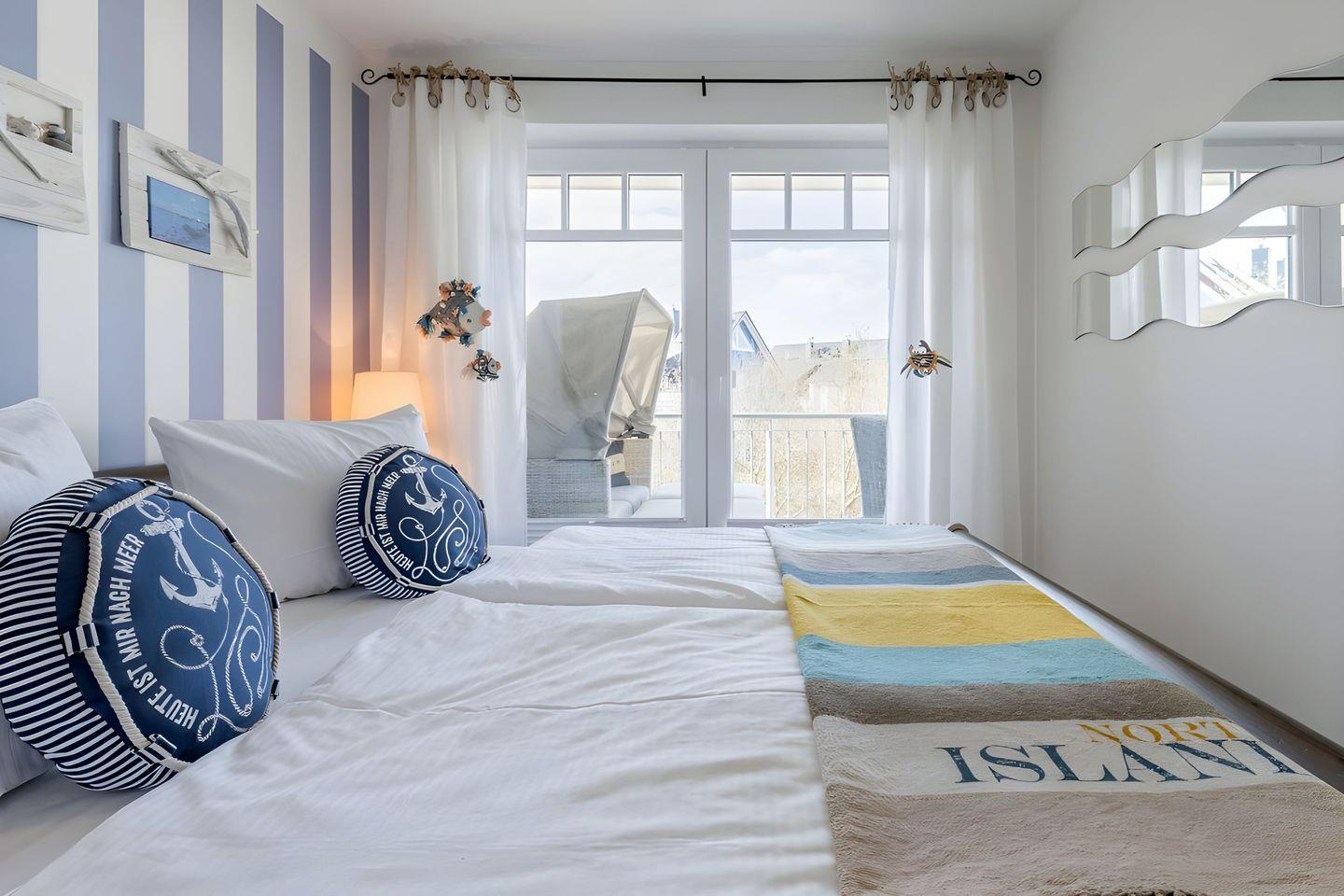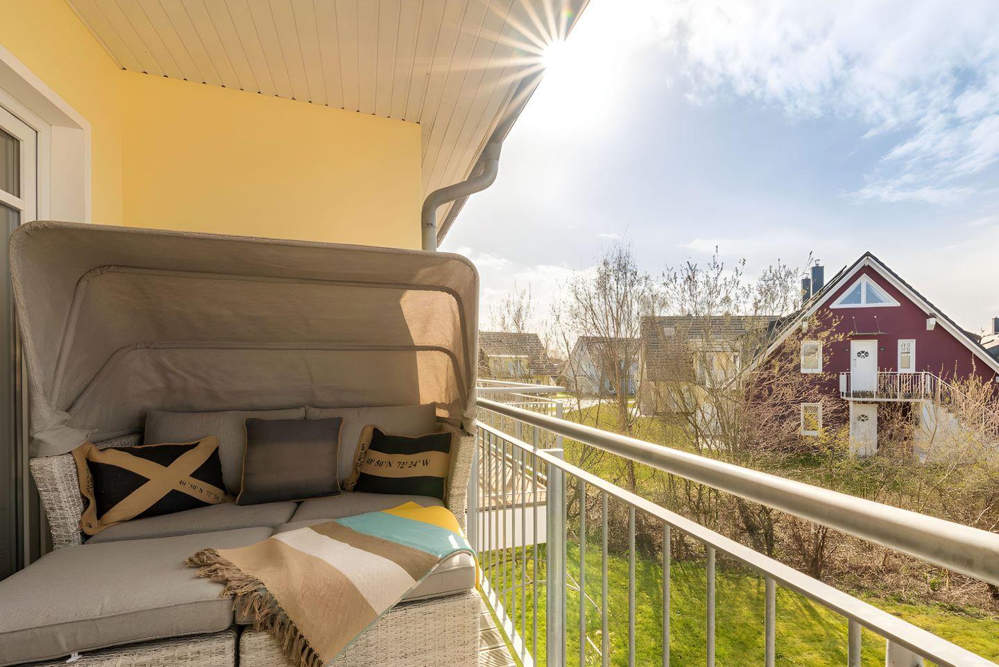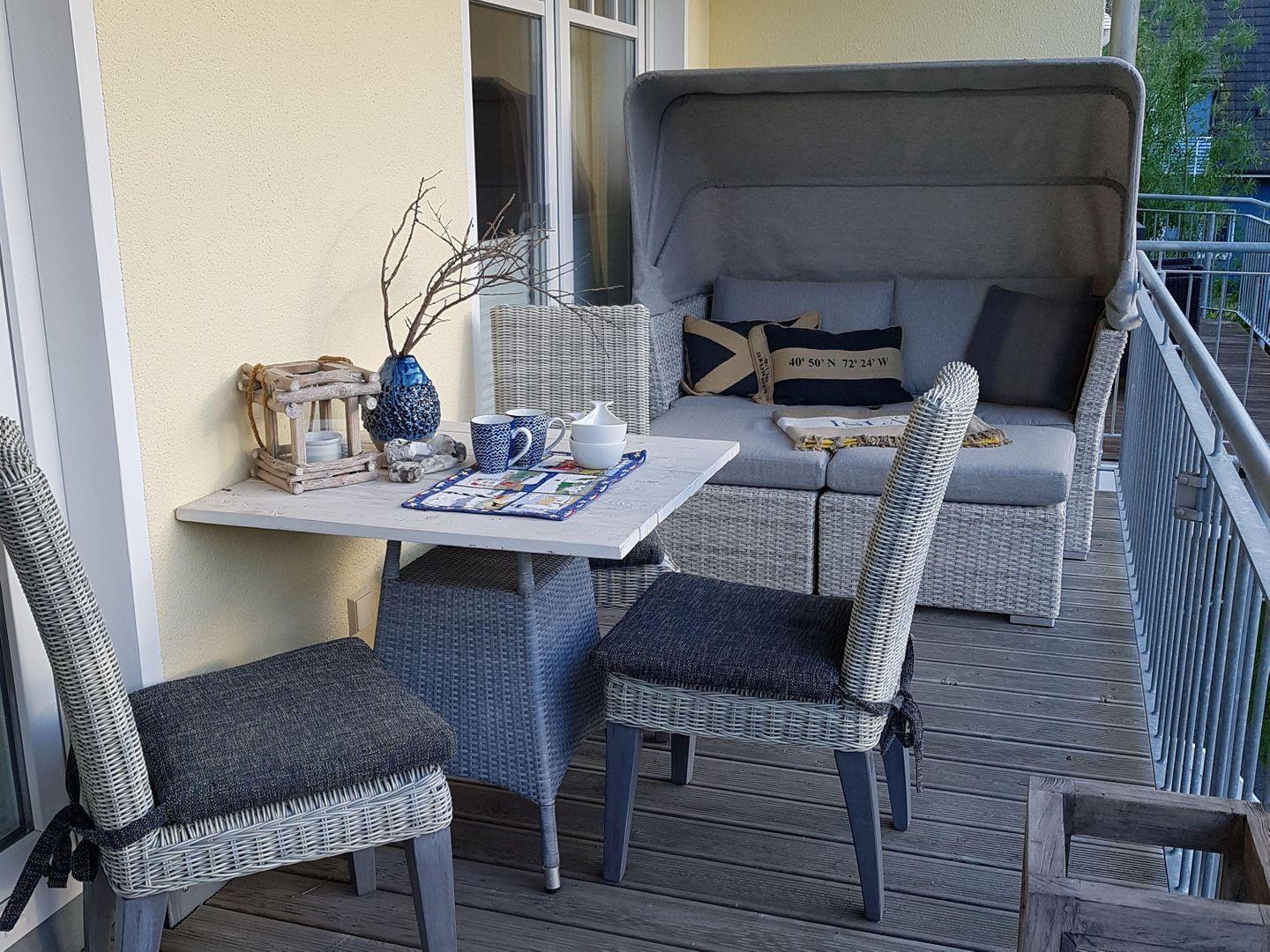 Auf den herrlichen BALKON mit Meerblick gelangen Sie über Wohn- und Schlafzimmer. Neben der Balkonausstattung mit Tisch und Stühlen erwartet Sie zudem ein Strandkorb.