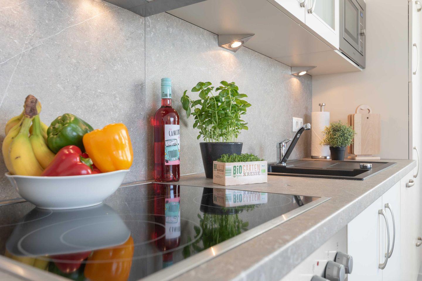 Wohn-/Essbereich mit integrierter Küchenzeile inkl. Kühlschrank, Ceranfeld,