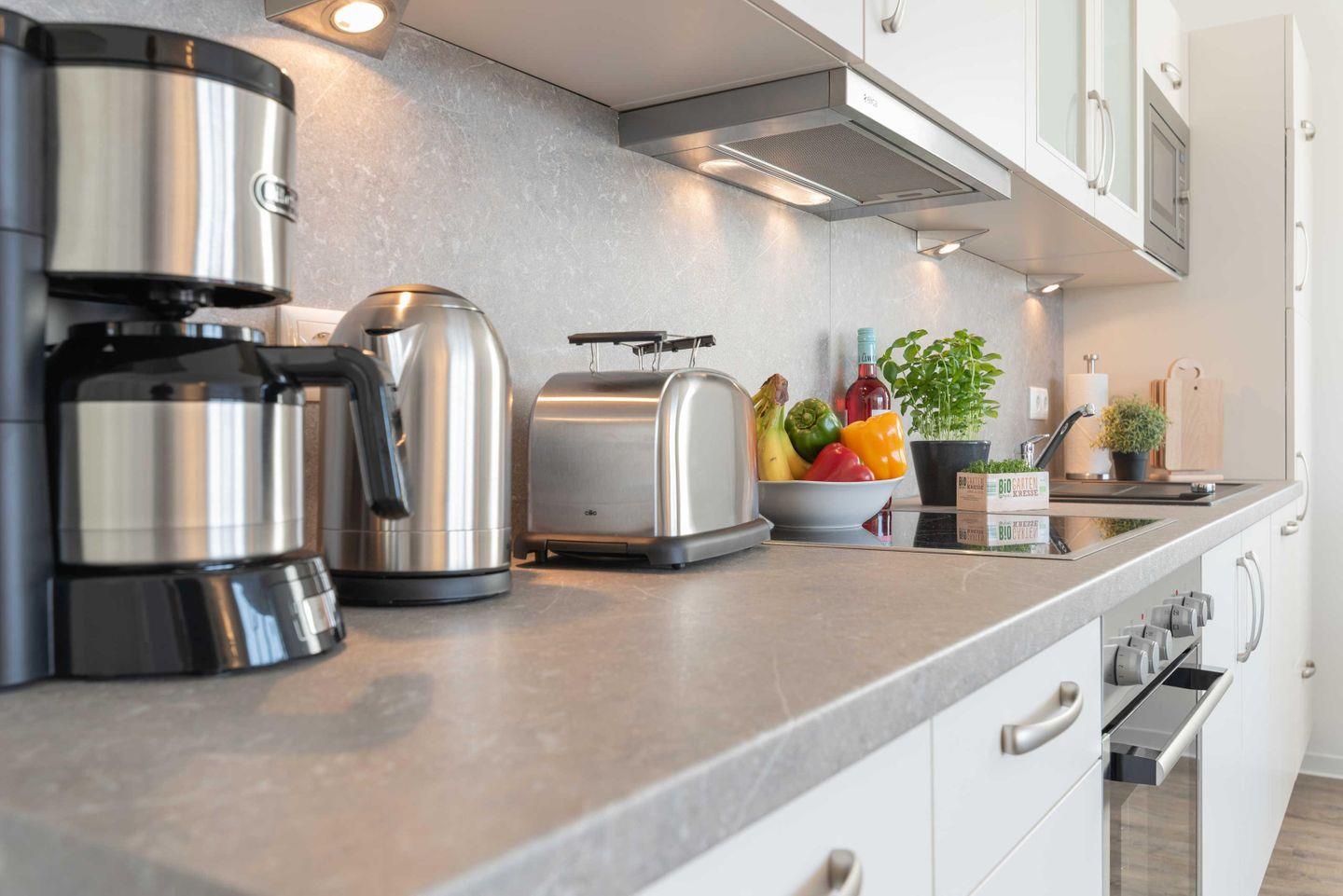 Backofen, Mikrowelle, Geschirrspüler und Dunstabzugshaube. Das helle Bad