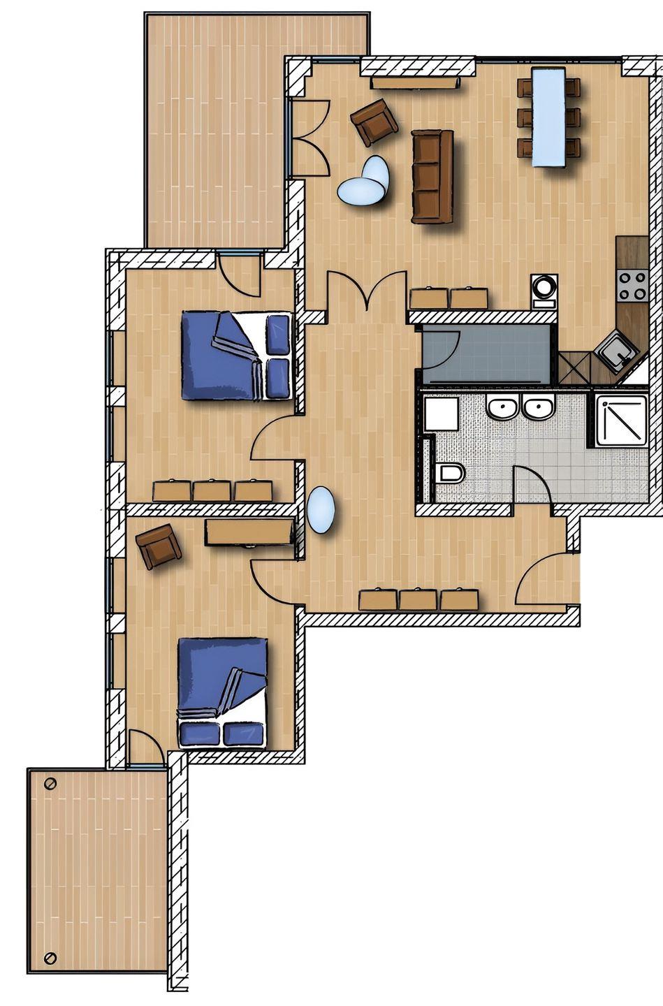 Die geräumige Drei-Zimmer-Wohnung im Erdgeschoss ist für maximal sechs Personen ausgestattet und bietet höchsten Komfort. Das knapp 30 qm große WOHNZIMMER ist sehr gemütlich gestaltet und kann neben der Wohnlandschaft mit ausklappbarer Schlafcouch für zwei weitere Personen, einem Flachbildschirm TV, einem DVD-Player, einer Stereoanlage und einem Kaminofen (Kaminholz kann nicht gestellt werden) sowie einer komfortablen Essecke mit sechs Lederstühlen aufwarten.