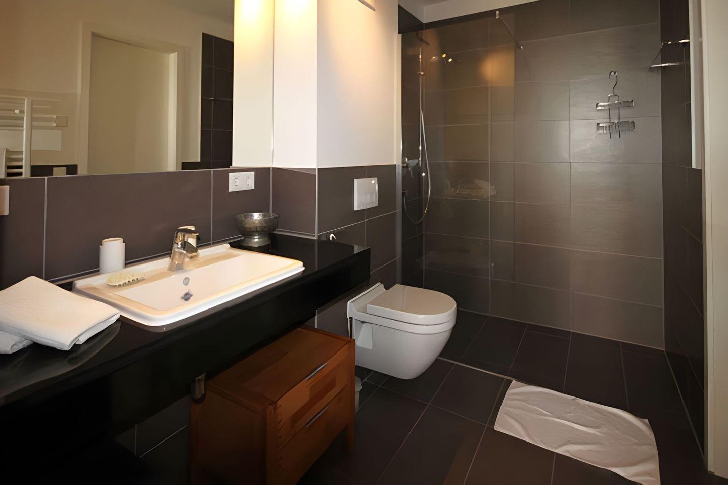 großzügige, elegante Duschbad verfügt über eine bodengleiche Dusche und einen