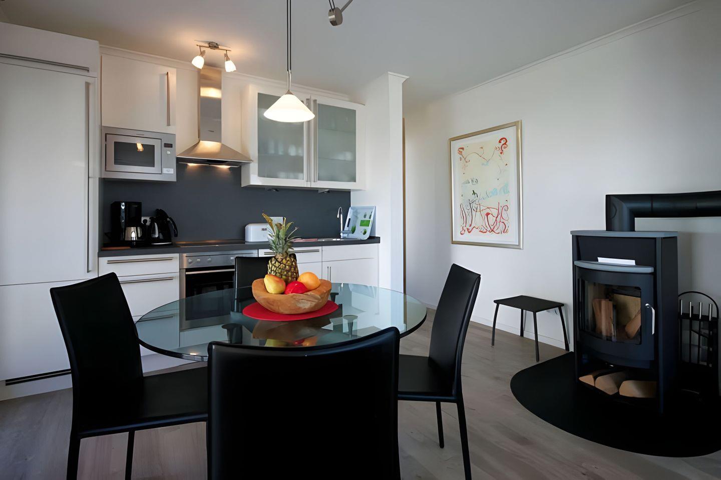 gleichfarbigen Kaminofen (Kaminholz muss selbst organisiert werden.). Die offene