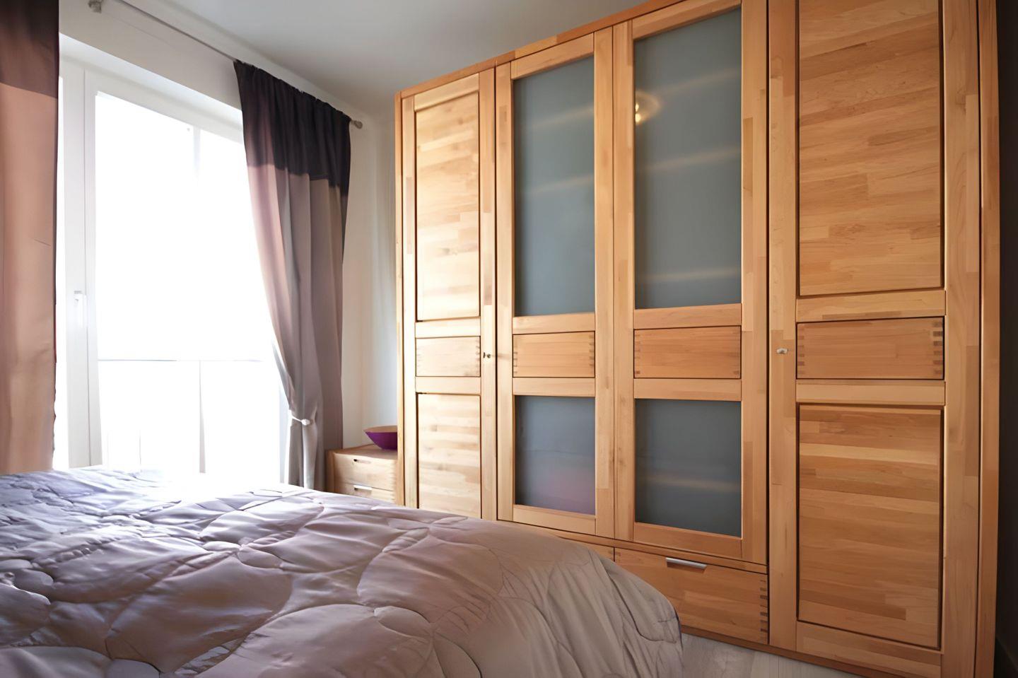 90 x 200 cm) und einem viertürigen Schrank aus Holz und Glaselementen. Das