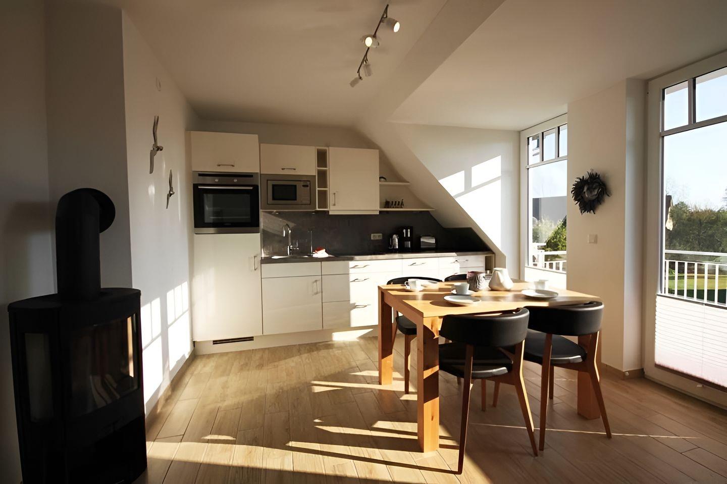 In der OFFENEN EINBAUKÜCHE inklusive Essbereich und mit großzügigem Massivholztisch sowie vier bequemen Stühlen, finden Sie die voll ausgestattete Küchenzeile. Mit Mikrowelle, Backofen, Cerankochfeld, Geschirrspüler und Kühl-/Gefrierkombination lässt diese keine Wünsche offen.