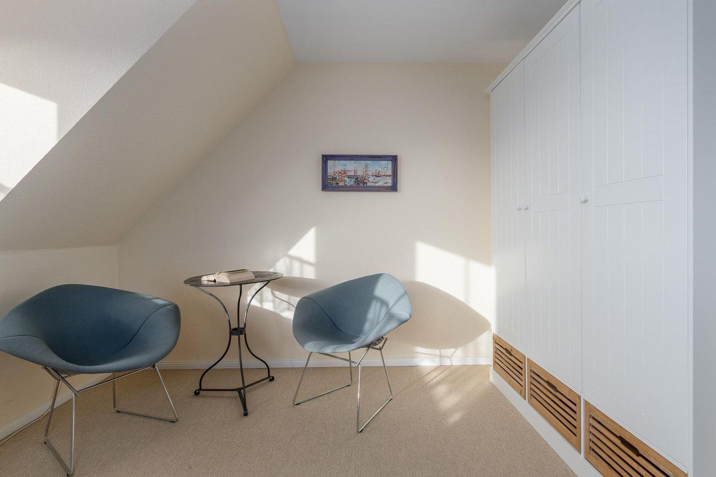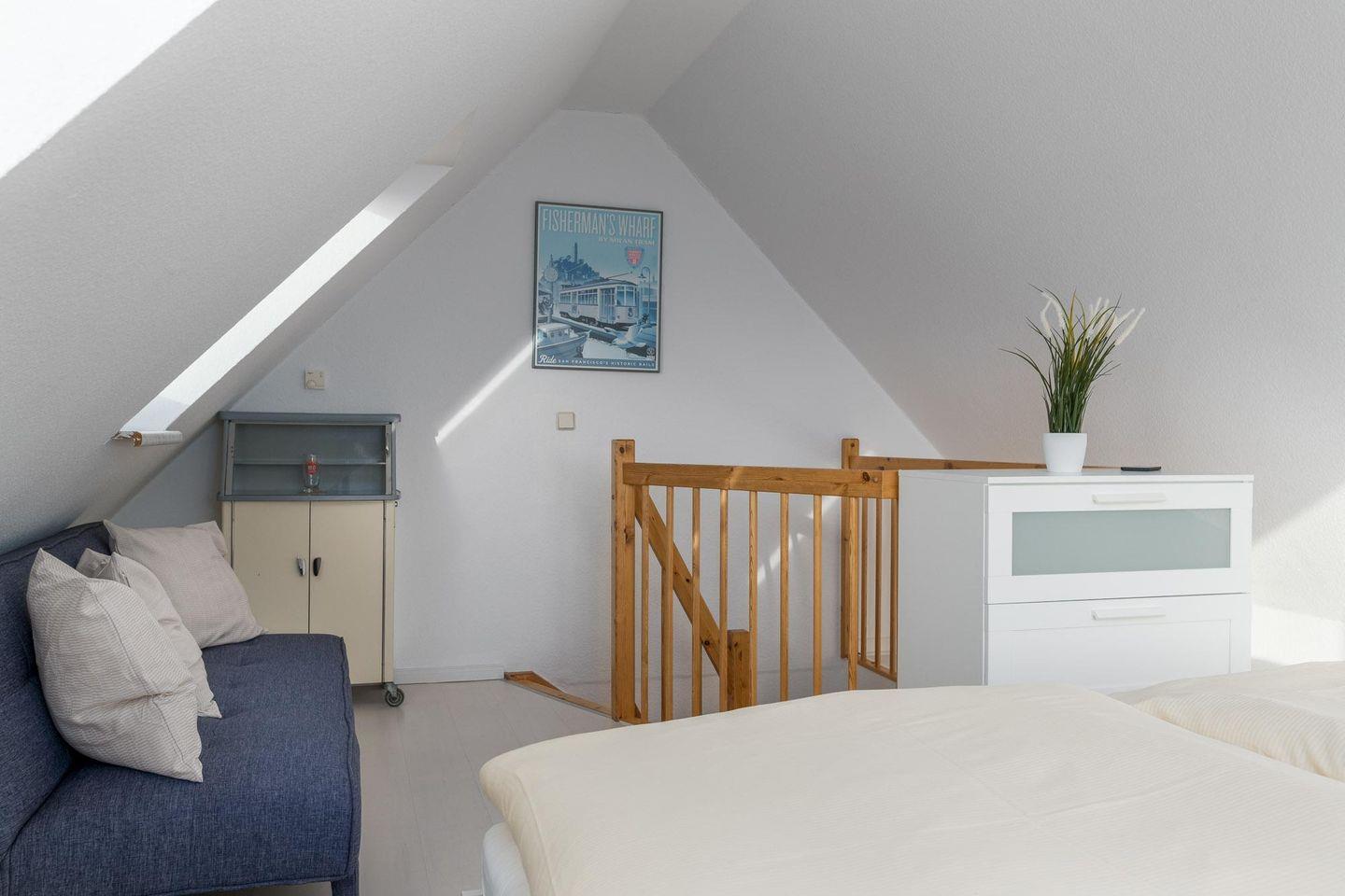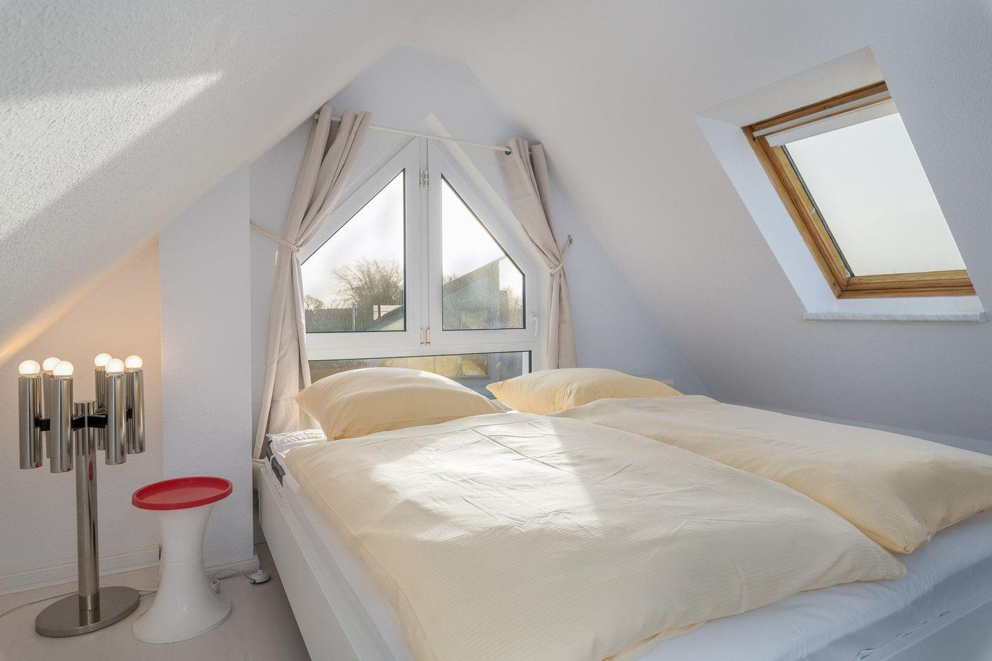 Im Schlafzimmer der ersten Etage befinden sich ein Doppelbett (zwei Matratzen mit 180 x 200 cm Topper), ein Kleiderschrank, ein kleiner Wäscheschrank, ein Standspiegel, ein kleiner TV (Satellitenanlage) sowie ein kleiner Bistrotisch mit zwei Sesseln für die kleine Pause zwischendurch. Im kleineren Zimmer der ersten Etage erwarten Sie ein Einzelbett mit den Maßen 100 x 200 cm und eine Kommode. Im anderen, etwas größeren Zimmer sorgen ein Doppelbett (140 x 200 cm), zwei Kommoden und Leselämpchen am Bett für eine gelungene Nachtruhe. In der Galerie der Dachspitze integriert ist ein lauschiges Schlafzimmer mit Doppelbett (180 x 200 cm/ zwei Matratzen/ einzelne Topper), Sideboard, verdunklungsfähigen Dachflächenfenstern und Giebelfenster mit Vorhang. Ein Wäscheset kann pro Person kostenpflichtig zugebucht werden.