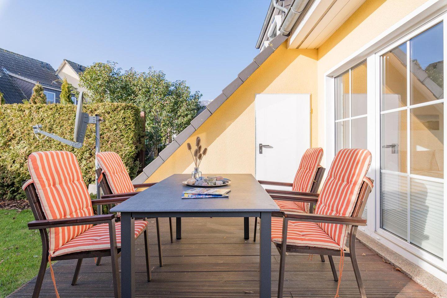 Das lichtdurchflutete Wohnzimmer mit großzügiger Eck-Couch und einem Ausziehtisch ist optimal für bis zu sieben Personen eingerichtet. Ein 55 Zoll Flatscreen und eine kleine Kompakt-HiFi-Anlage (externe Medien anschließbar) sorgen für bunte Unterhaltung. Von hier gelangen Sie auf die Terrasse. Dort lädt eine Ausstattung mit Möbeln, Sonnenschirm und vorhandenem Holzkohlegrill zu bunten Sommerabenden ein. Die Außenanlage wurde Ende 2021 komplett neugestaltet.