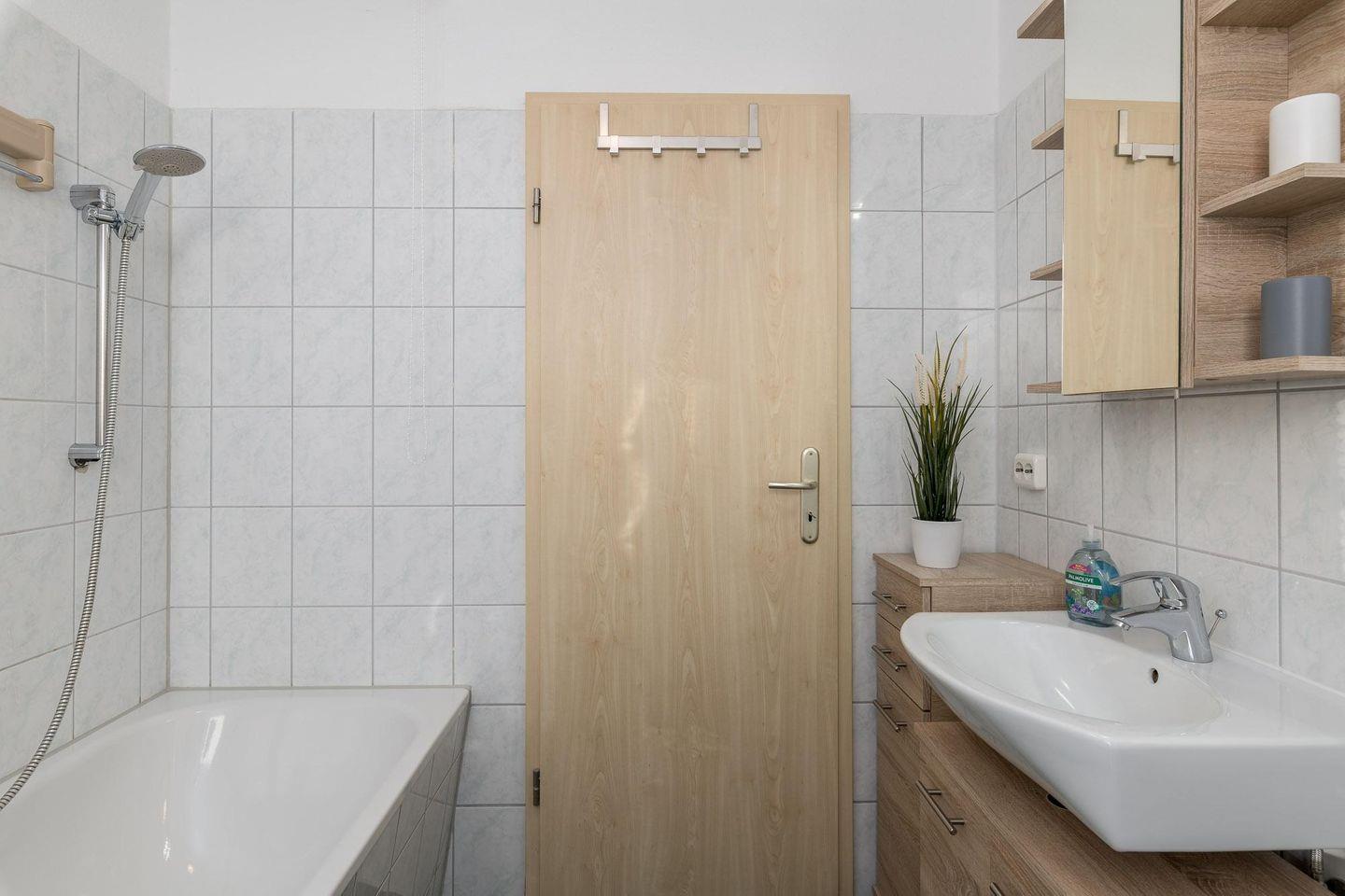 Das Badezimmer ist mit einer Badewanne, einem Waschtisch und Haartrockner ausgestattet.
