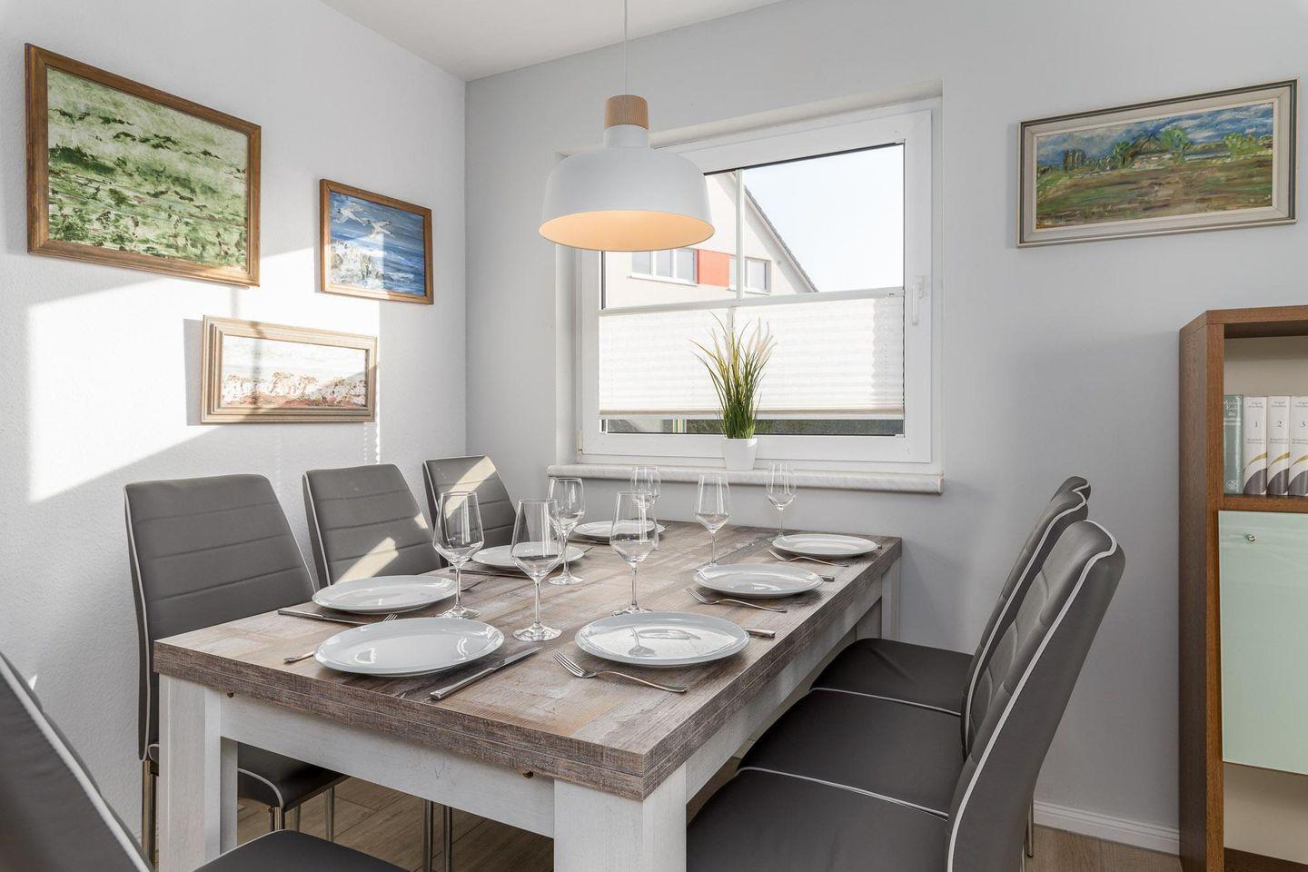 Die Doppelhaushälfte Am Krug bietet auf ca. 107 m² Platz für bis zu 7 Personen, drei Schlafzimmer, eine offene Küche, einen Garten mit Terrasse und Grill sowie kostenfreie Parkplätze. Zur Ausstattung zählen WLAN, Kabel-TV, Badewanne, Gäste-WC, Babybett und Hochstuhl. Der Strand ist nur 100 m entfernt, Haustiere (maximal 2) sind willkommen (10€/Nacht pro Haustier, sowie einmalig Haustierendreinigung in Höhe von 25€).