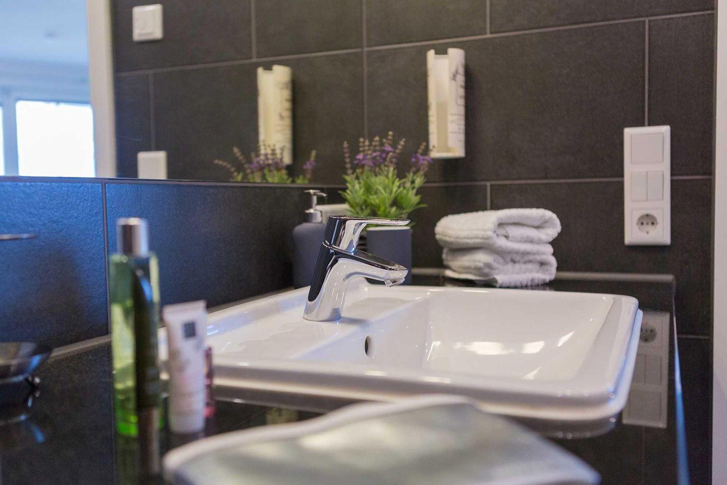 Duschbereich mit großer Kopfdusche sowie der definierte Waschtisch mit großem