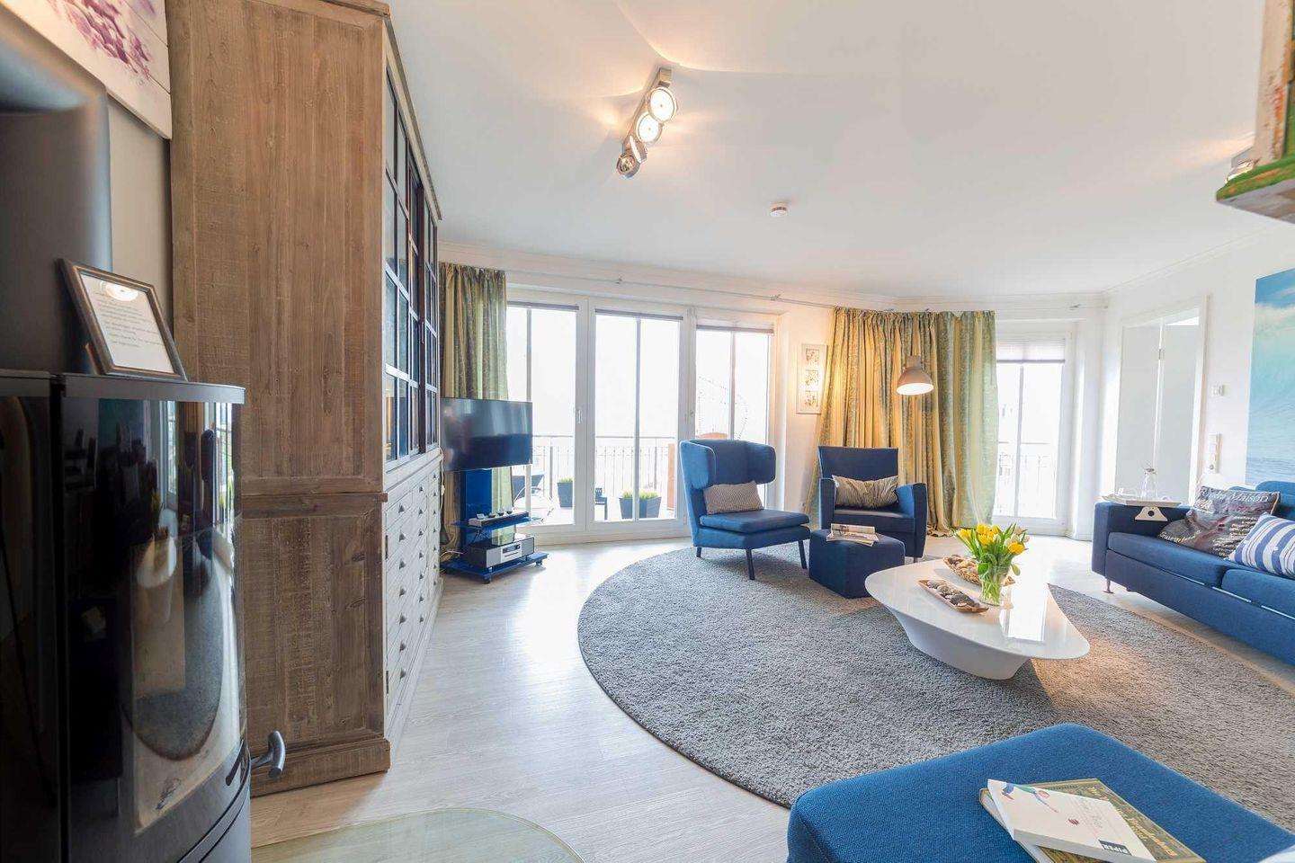 Das maritim eingerichtete Wohnzimmer verfügt über einen HD-Flatscreen-TV, einen