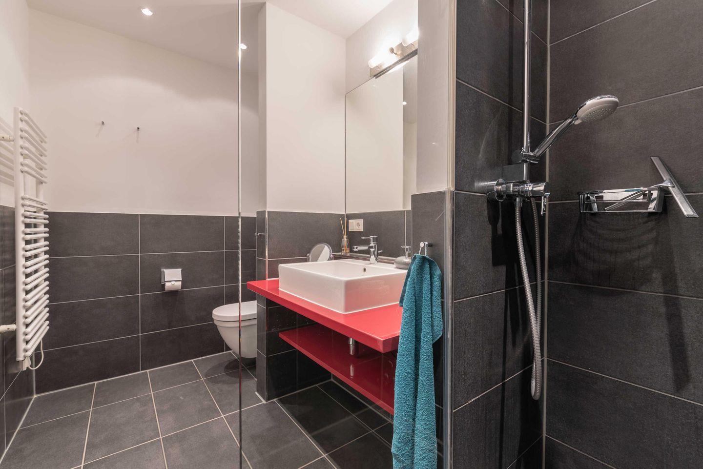 Kosmetikspiegel, einer ebenerdigen Dusche und einem Handtuchheizkörper