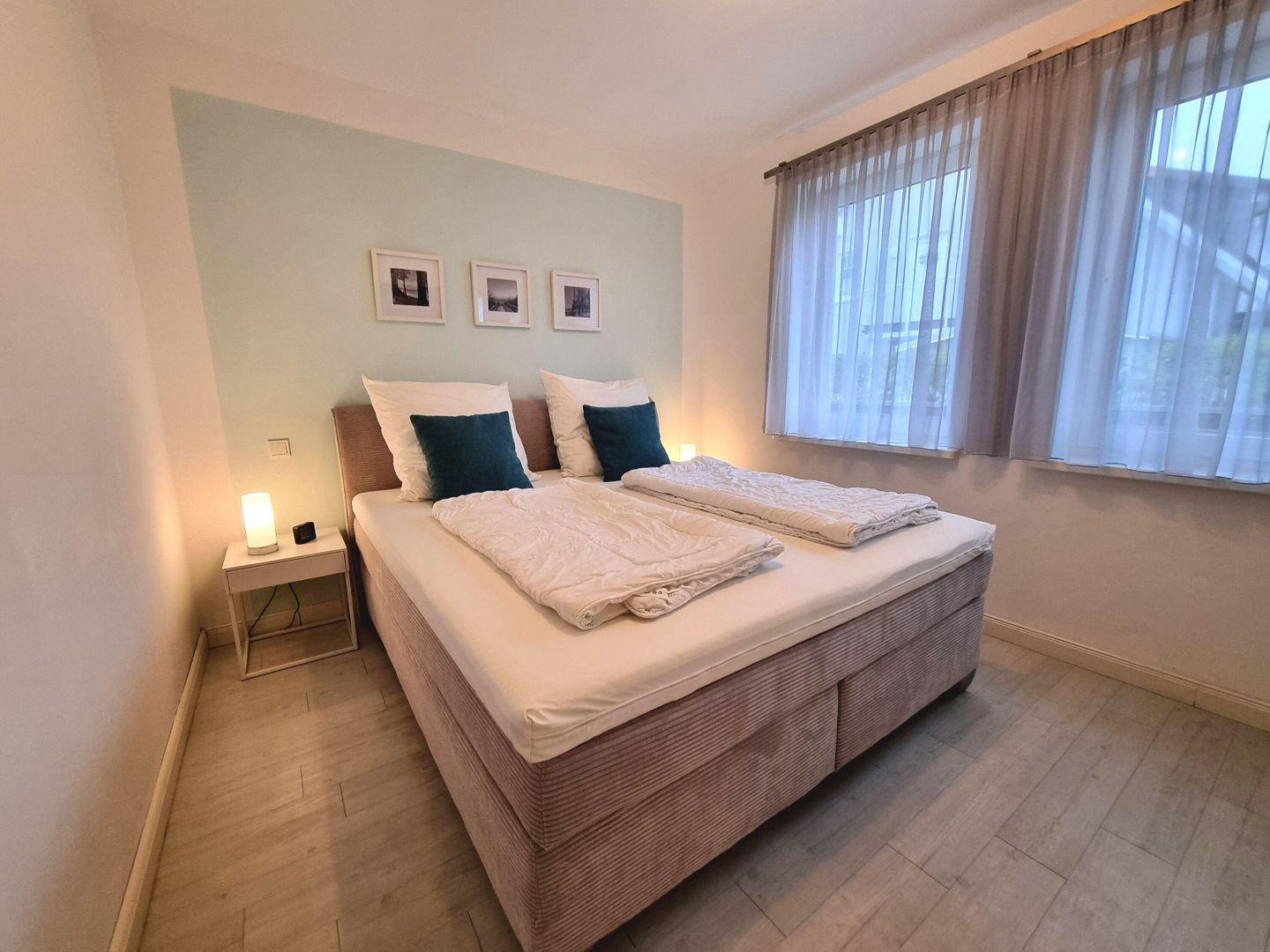 Im Schlafzimmer empfangen Sie ein luxuriöses Boxspring-Bett (1,80 x 2,00 m), ein