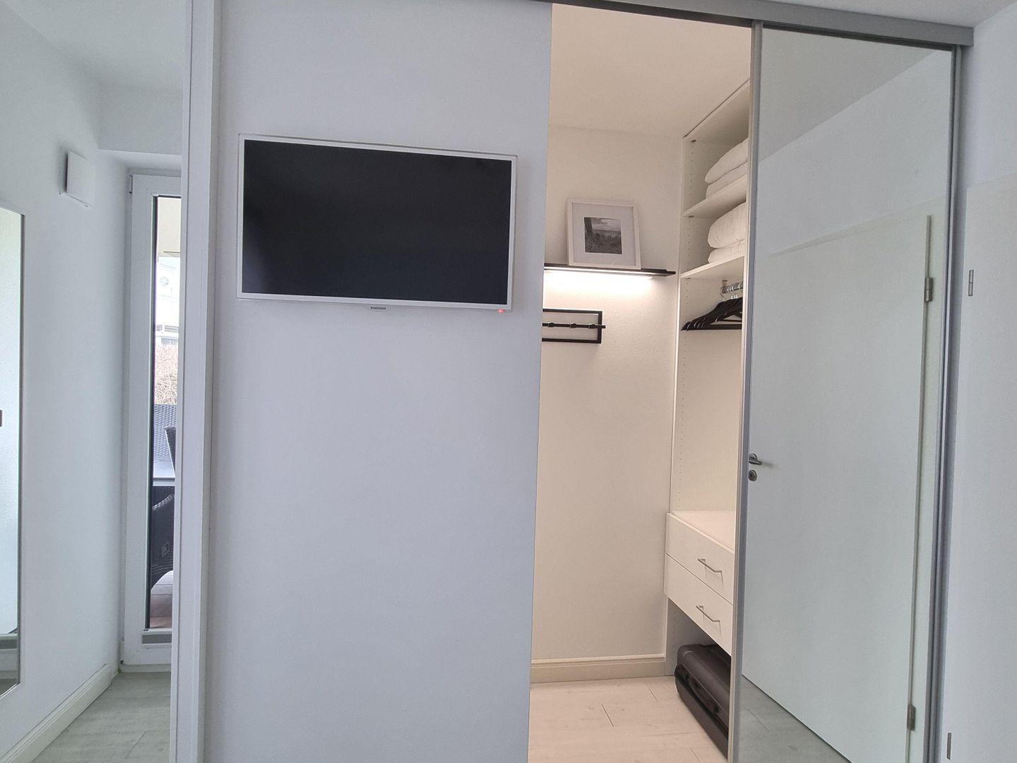 Smart-TV, zwei Nachttische, ein Sitzhocker und ein begehbarer Einbauschrank.