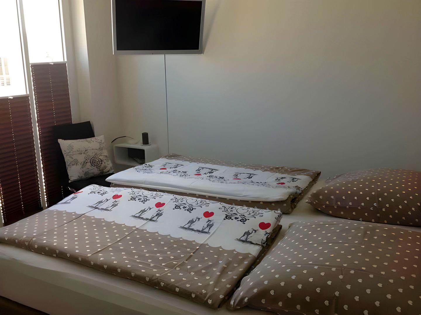 ein Boxspringbett (180 x 200 cm), ein Kleiderschrank und ein Flatscreen-TV. Das