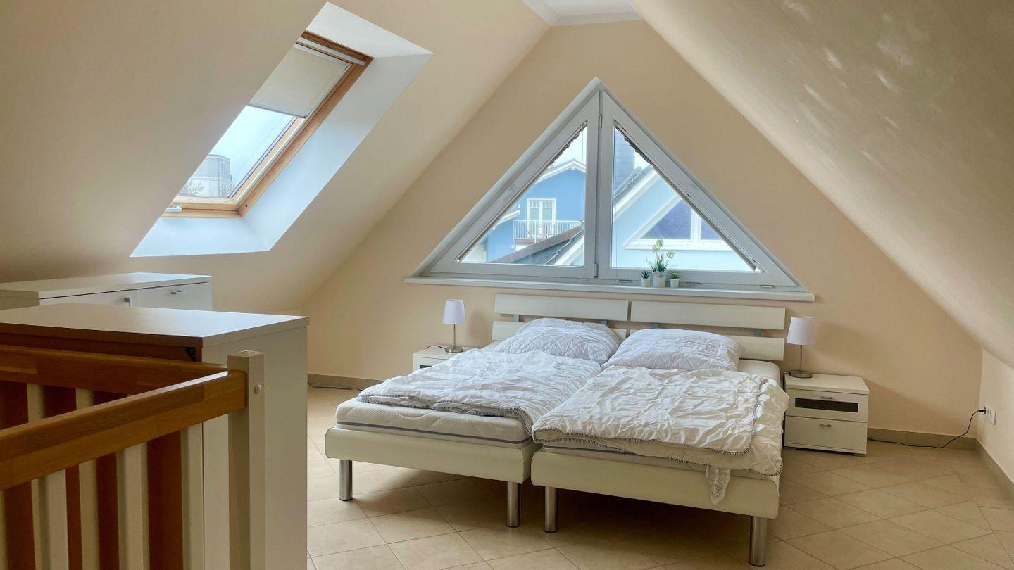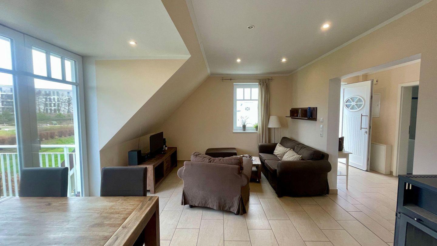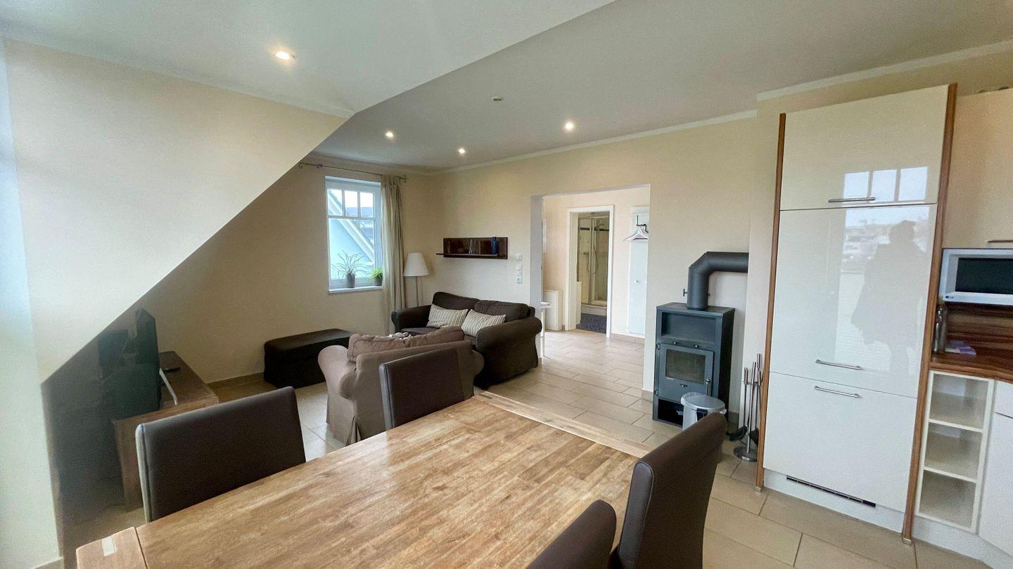 Die Wohnung verfügt über einen lichtdurchfluteten Wohnbereich, der mit einem gemütlichen Kaminofen ausgestattet ist – perfekt für entspannte Stunden bei kühlen Abenden. Zwei separate Schlafzimmer mit komfortablen Doppelbetten und ausreichend Stauraum in den Kleiderschränken bieten viel Platz für bis zu vier Personen. Das zweite Schlafzimmer erreichen Sie über eine innenliegende Treppe auf der oberen Ebene, die zusätzlichen Raum und Privatsphäre bietet.