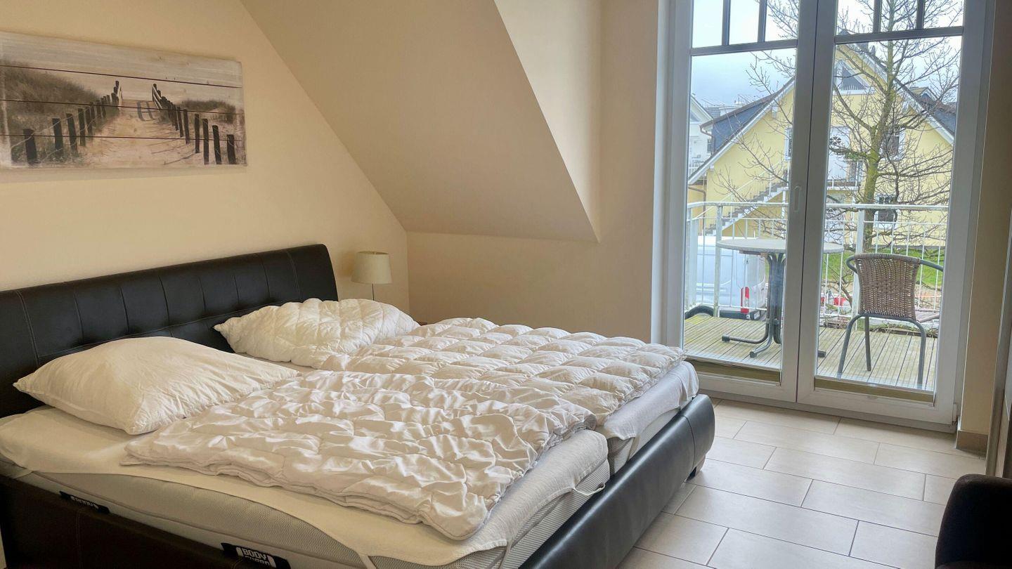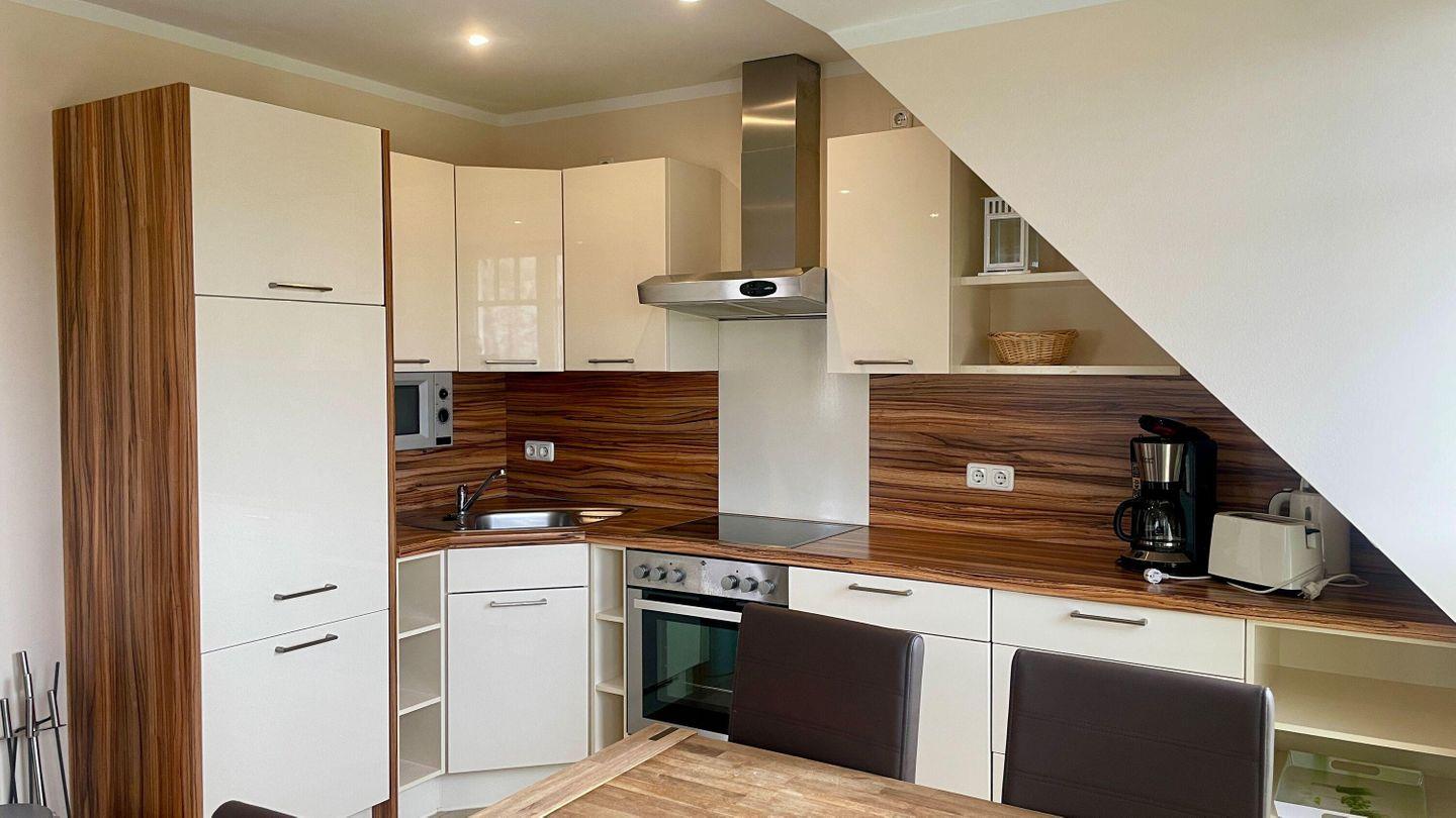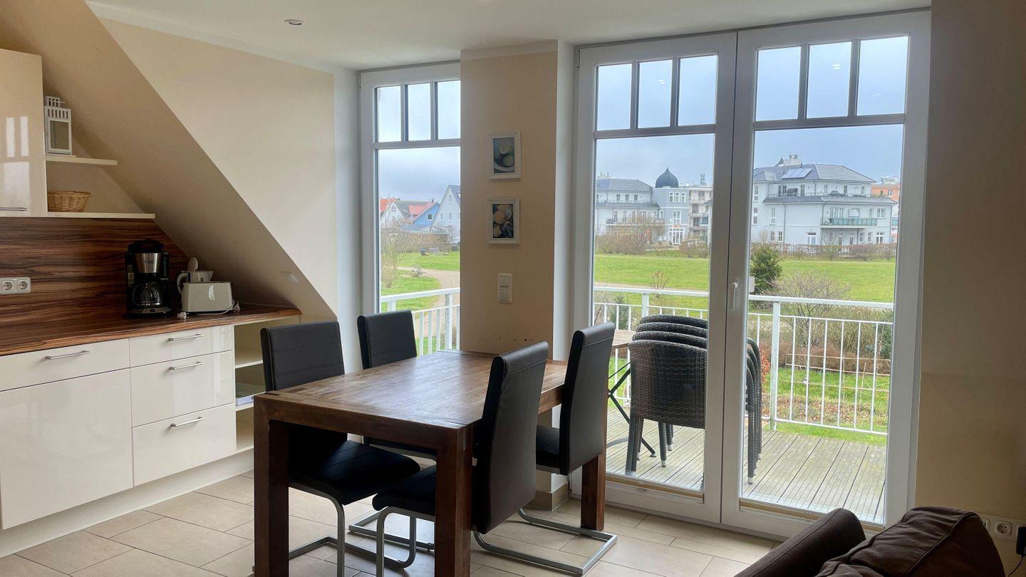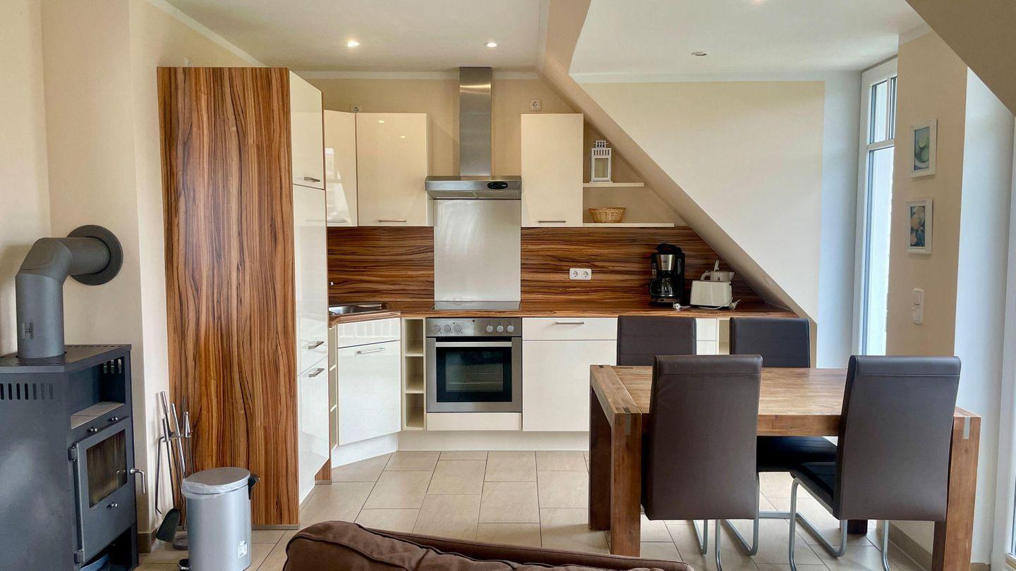 In der gut ausgestatteten Küche können Sie Ihre Mahlzeiten zubereiten. Sie finden hier einen Geschirrspüler, einen Backofen und eine Kaffeemaschine – ideal für den Start in den Tag. Vom Wohnbereich aus gelangen Sie auf den Balkon, auf dem Sie bei schönem Wetter entspannen und die frische Ostseeluft genießen können.