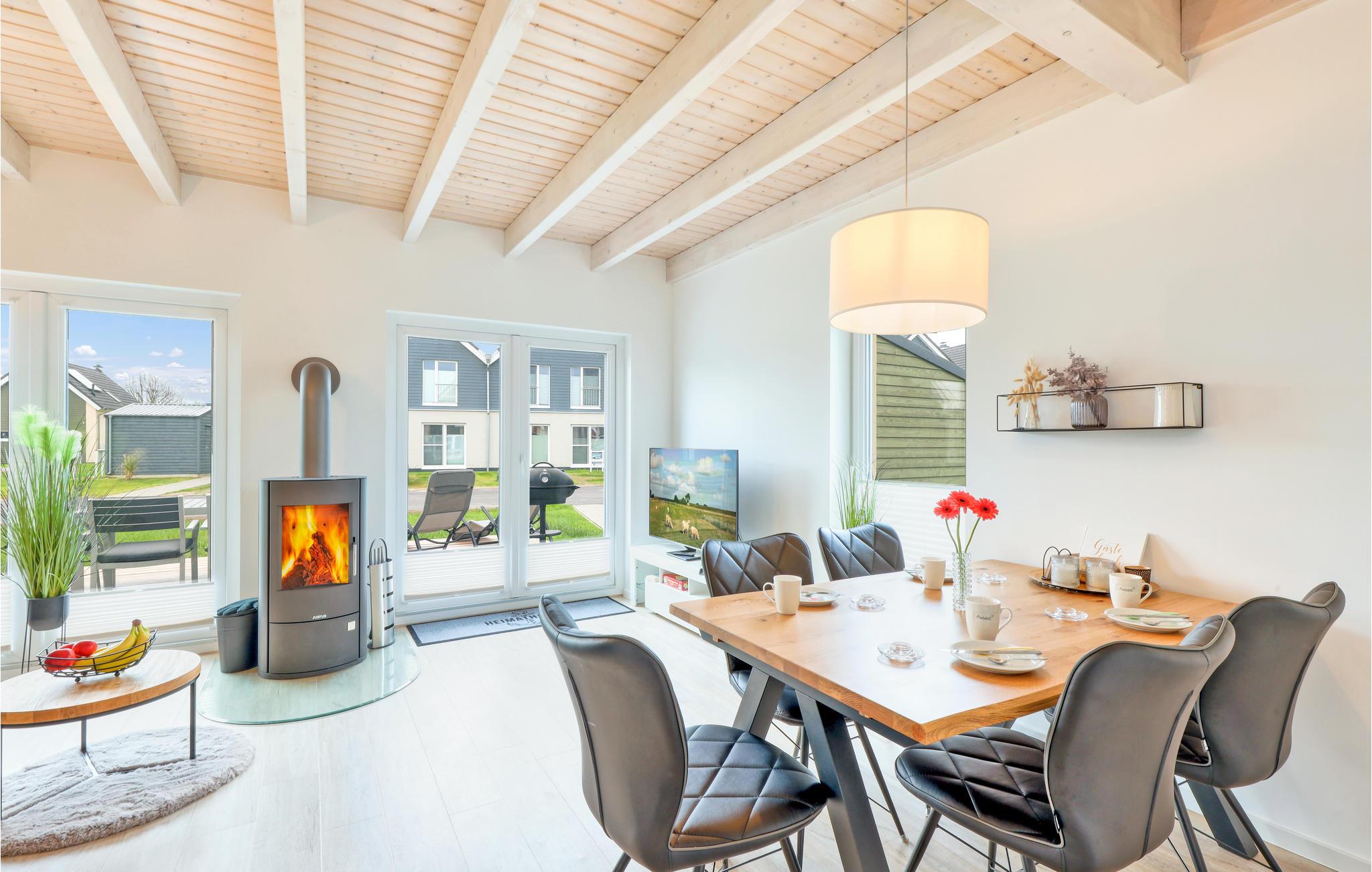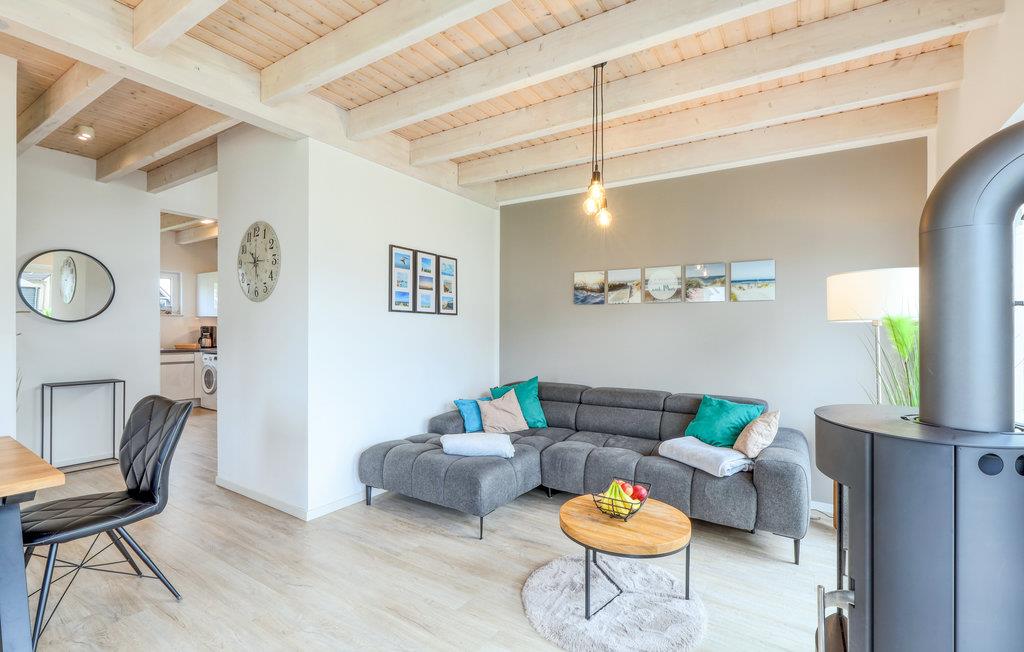 Fra opholdsstuen er der forbindelse til en rummelig terrasse med havemøbler, grill og grønt areal. Brændeovnen sørger for ekstra hygge i vinterhalvåret. Husets udstyr inkluderer også to fjernsyn og gratis WiFi. Udendørs finder I parasol, liggestol, badminton og boccia.