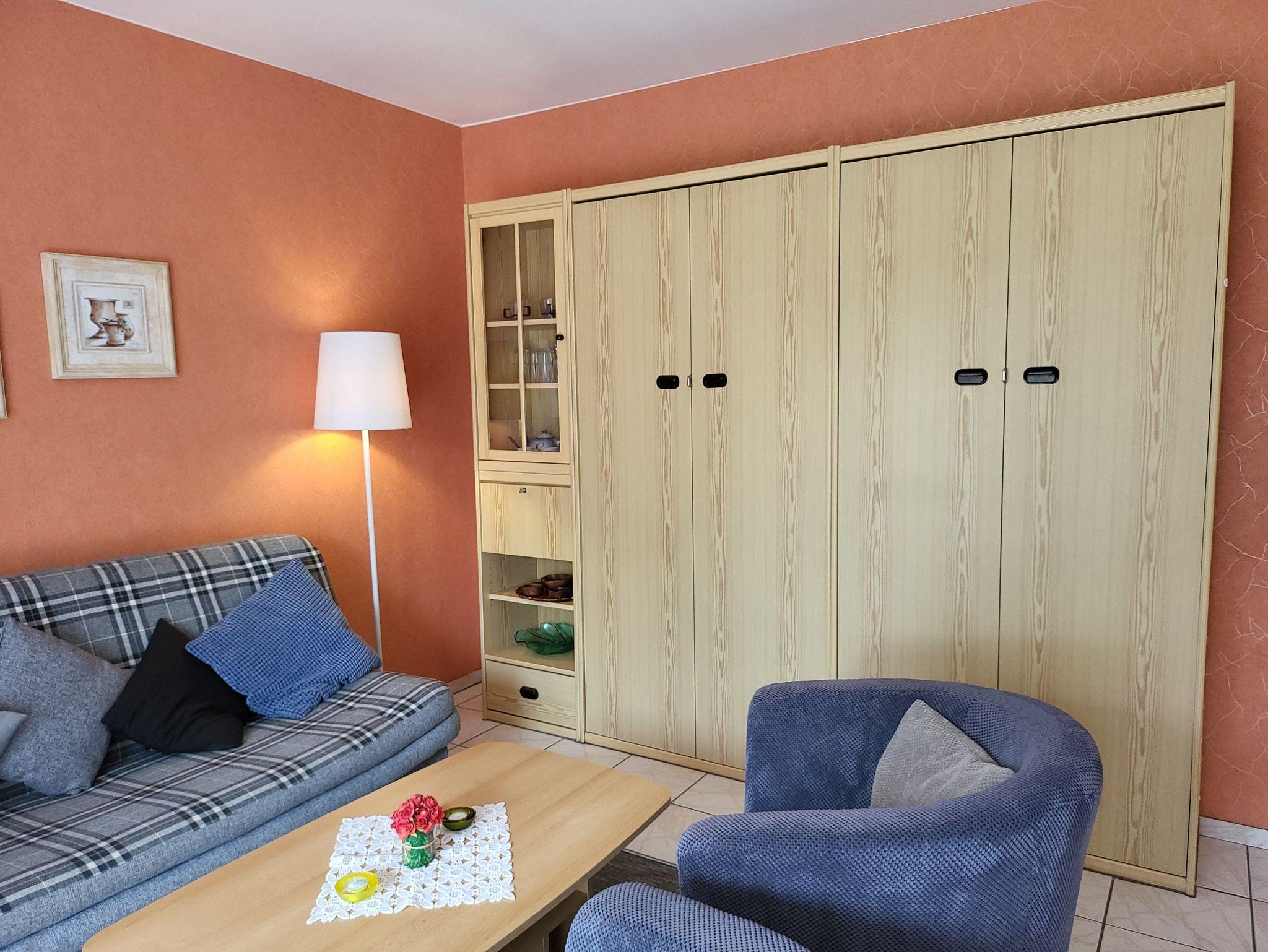 • Wohnraum mit gemütlicher Einrichtung. Bequeme Sitzgelegenheiten 3-Sitzer-Couch und 2 Sessel, Beistelltisch, Sat-TV, Radio mit CD und ein Schrank-Doppelbett zum Ausklappen. Der Fußboden ist mit Fliesen ausgelegt.