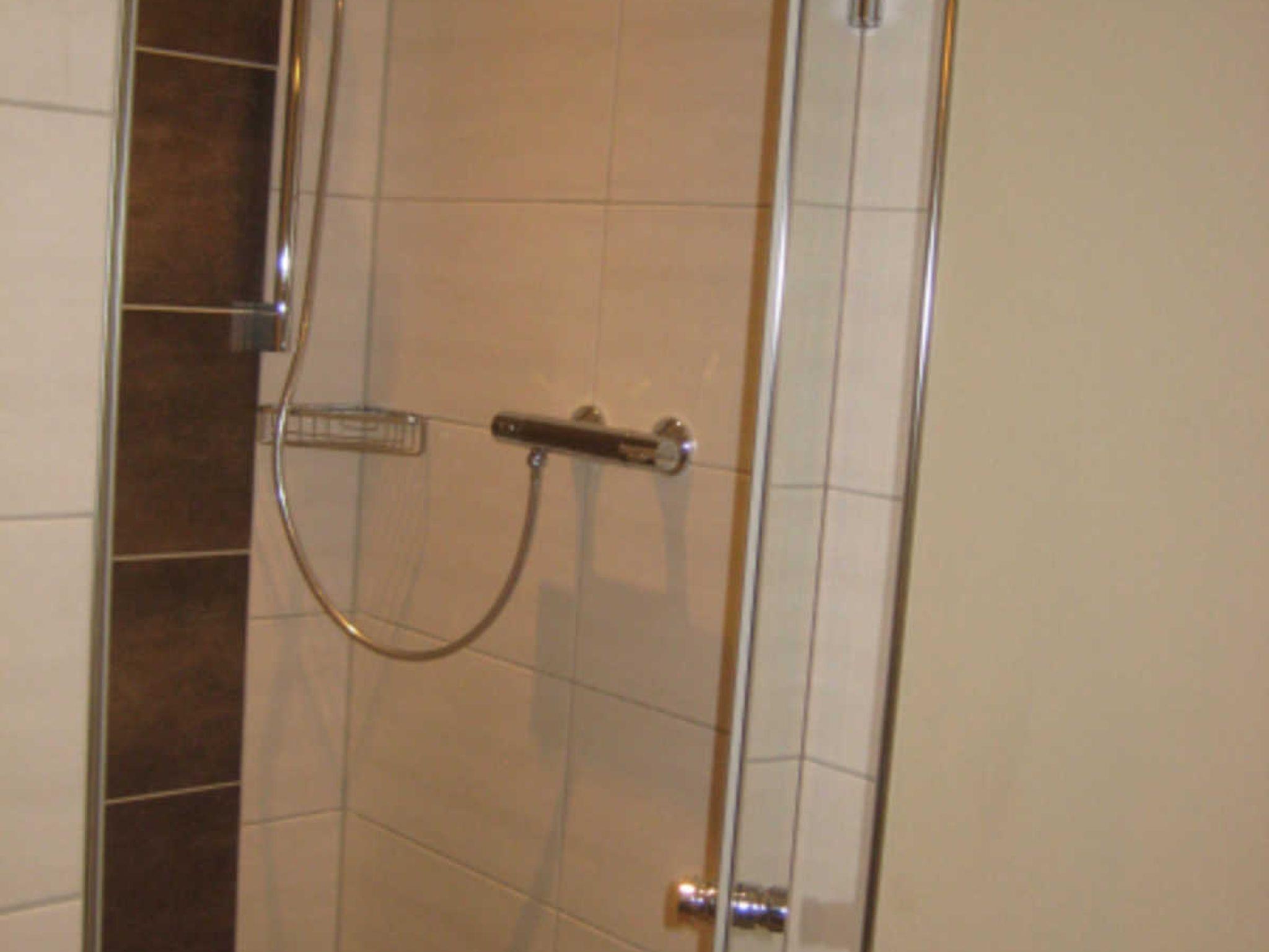 • Das modern eingerichtete Badezimmer ist mit Waschbecken, bodengleicher Dusche und WC ausgestattet.