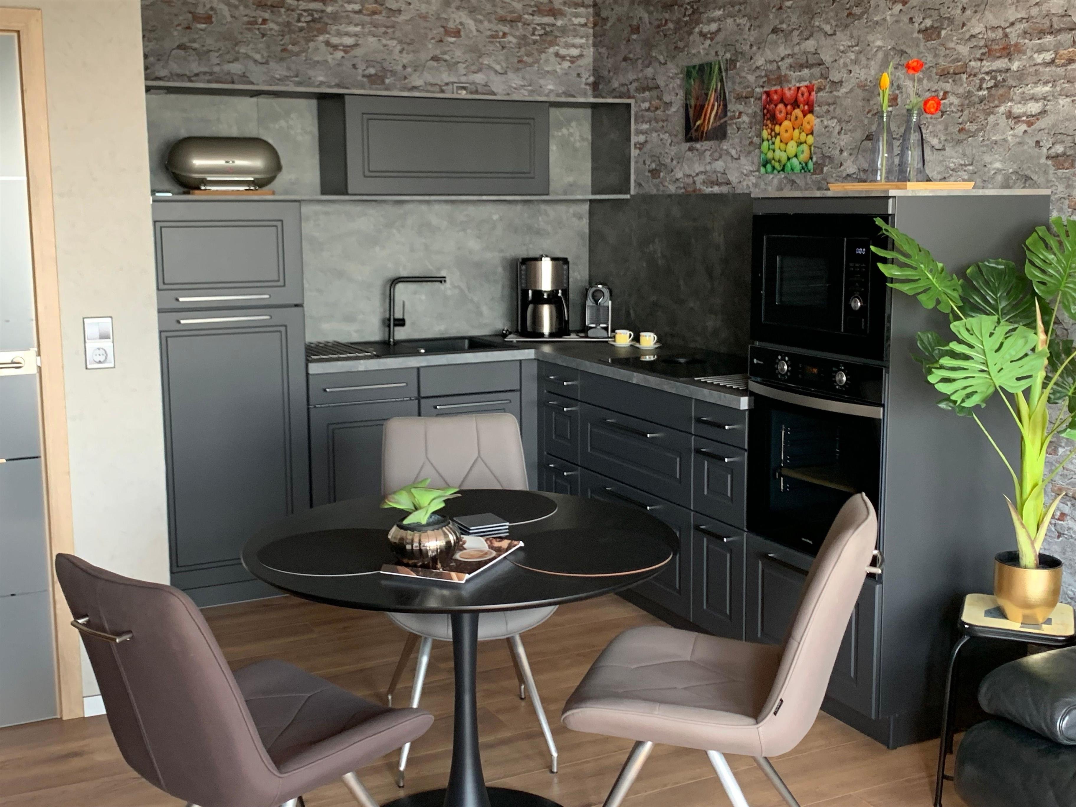 Die Wohnungn besteht aus einem Wohn/Küchenbereich, einen Schlafzimmer im Obergeschoß und einen neuen Duschbad. Die Wohnung wurde nach der Renovierung sehr hochwertig neu möbiliert und ausgestattet. Eine Einbauküche mit Kühl-Gefrierkombination, Geschirrspüler, Mikrowelle und Bora Cerankochfeld mit dazueghörigen Backofen. Selbstverständlich gehört zur Aiusstattung ein komplettes Geschirrpaket, Toaster, Wasserkocher, Kaffeemaschine, Nespressomaschine mit dazugehörigen Aufschäumer von Nespresso. Essplatz, Ledersofa und Conform Timeout Relaxsessel und Hocker.