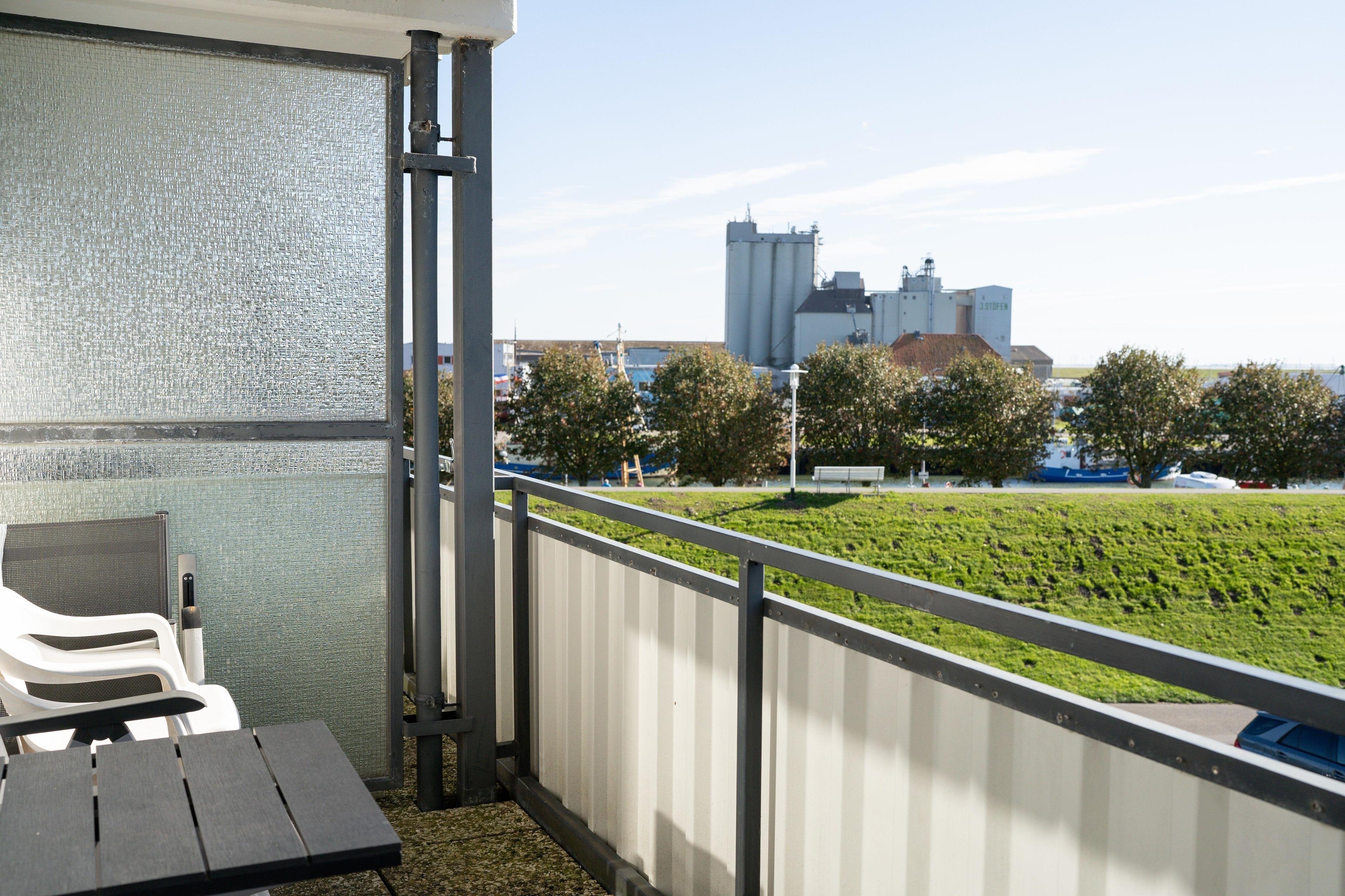 Der Balkon bietet einen direkten Blick auf den Fischereihafen von Büsum.