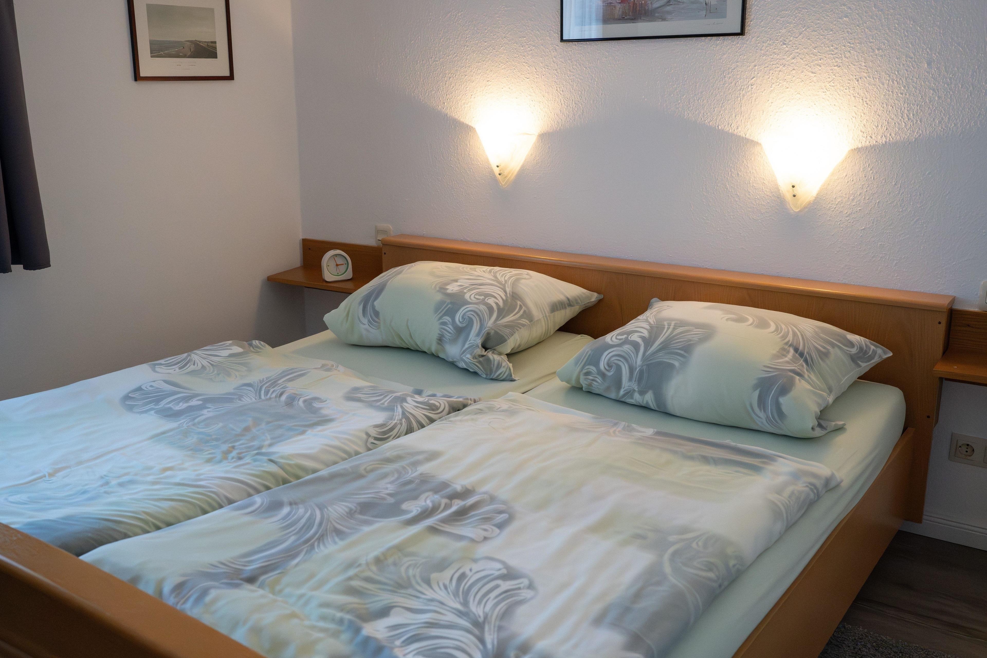 Im Schlafzimmer befindet sich ein Doppelbett mit zwei getrennten Matratzen, die eine Gesamtbreite von 180 cm bieten. Hier gibt es ebenfalls ein Aussenrollo.