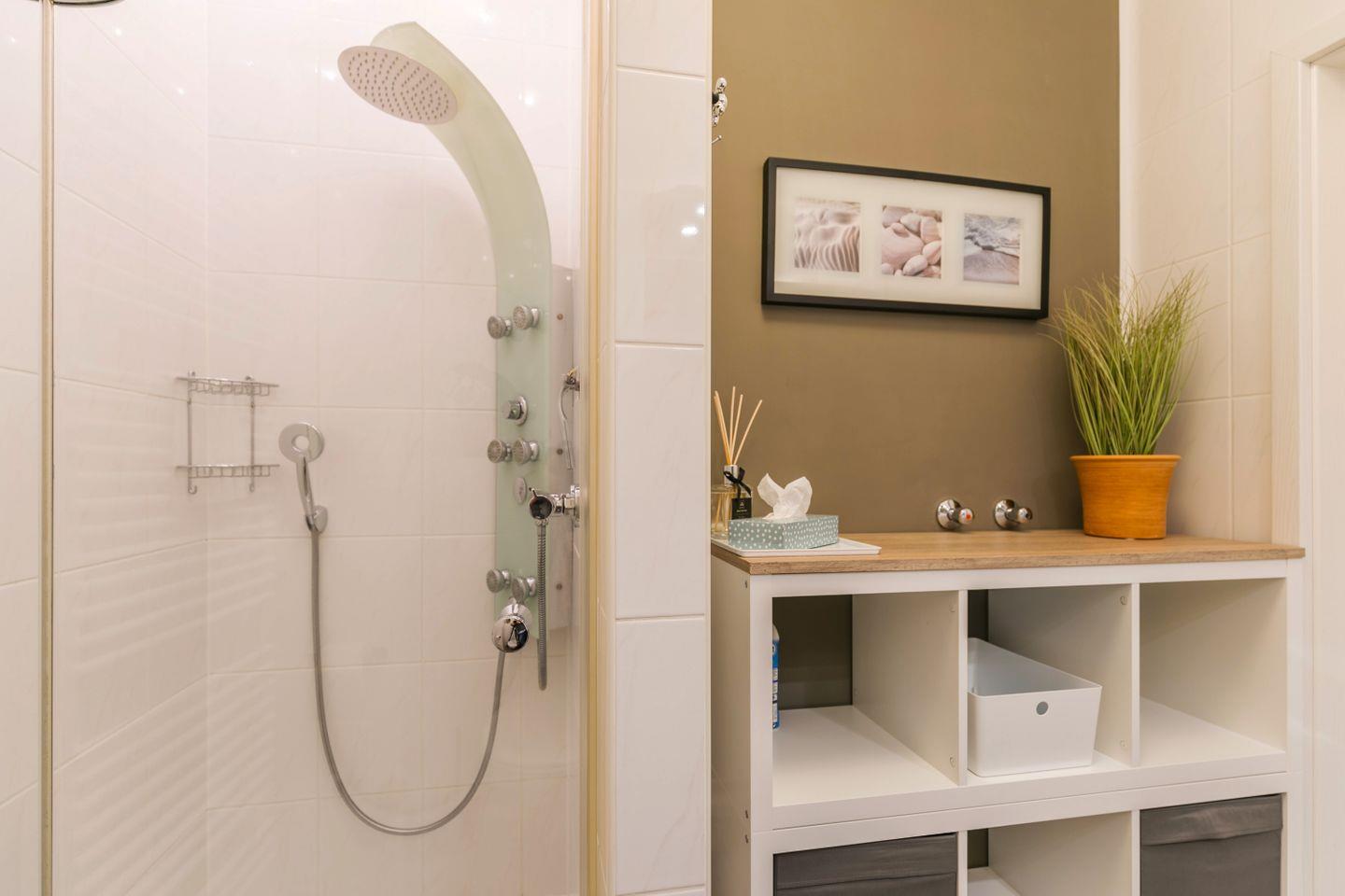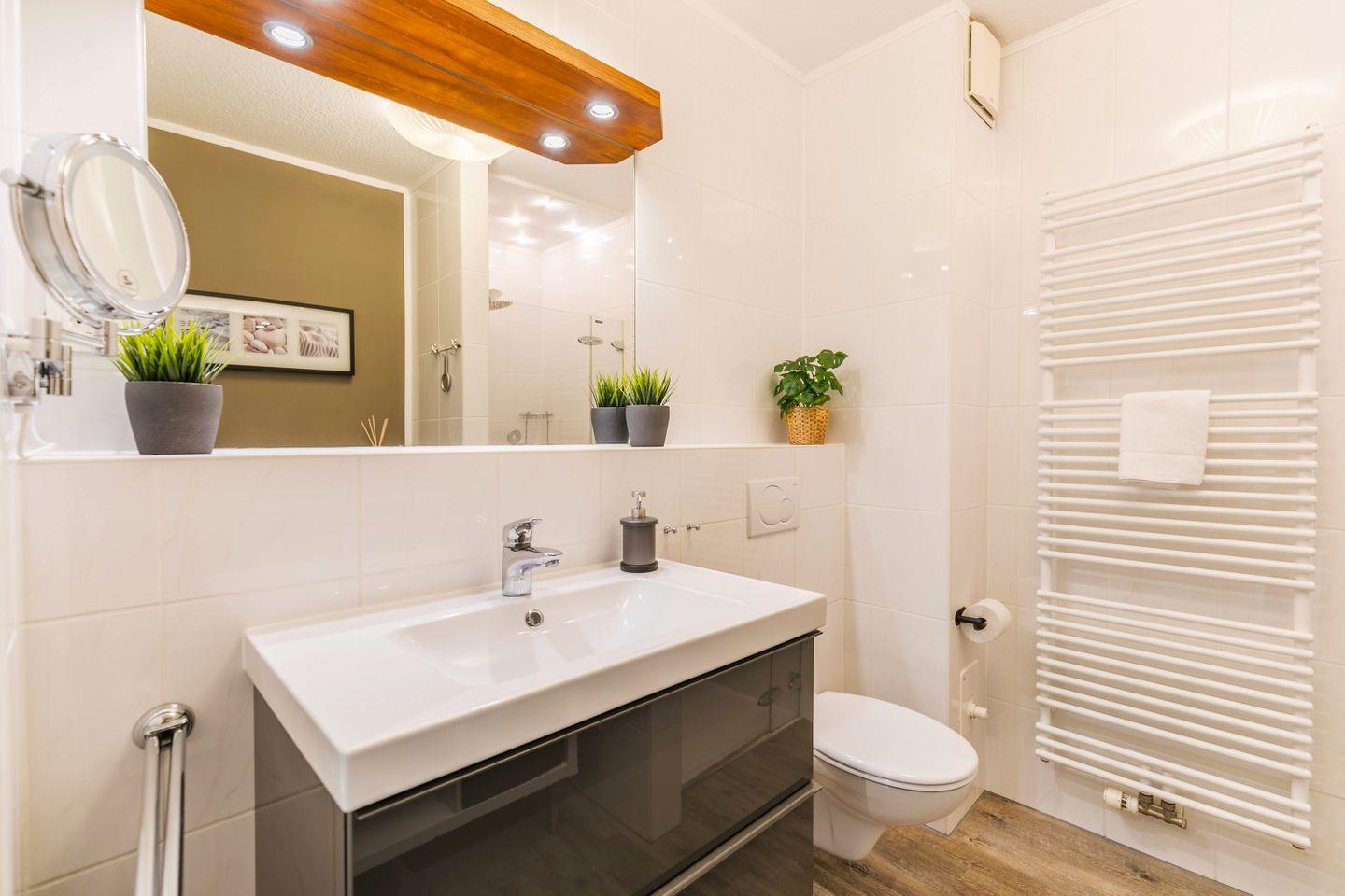 geräumige Dusche mit Sternenhimmel, WC, großer Spiegel, Föhn, Schränke, beleuchteter Kosmetikspiegel