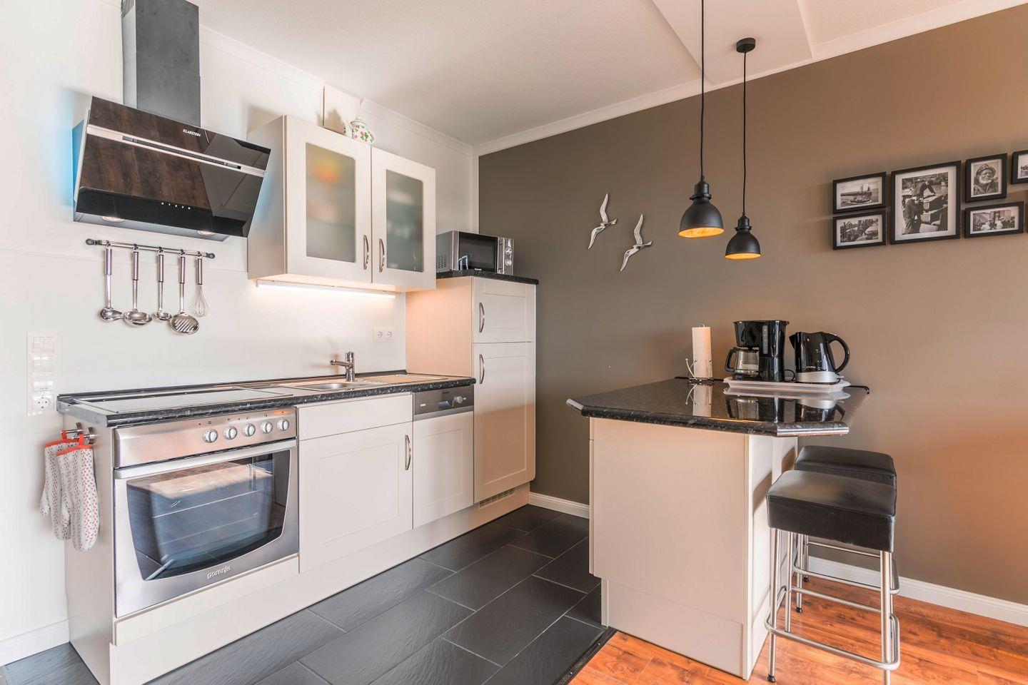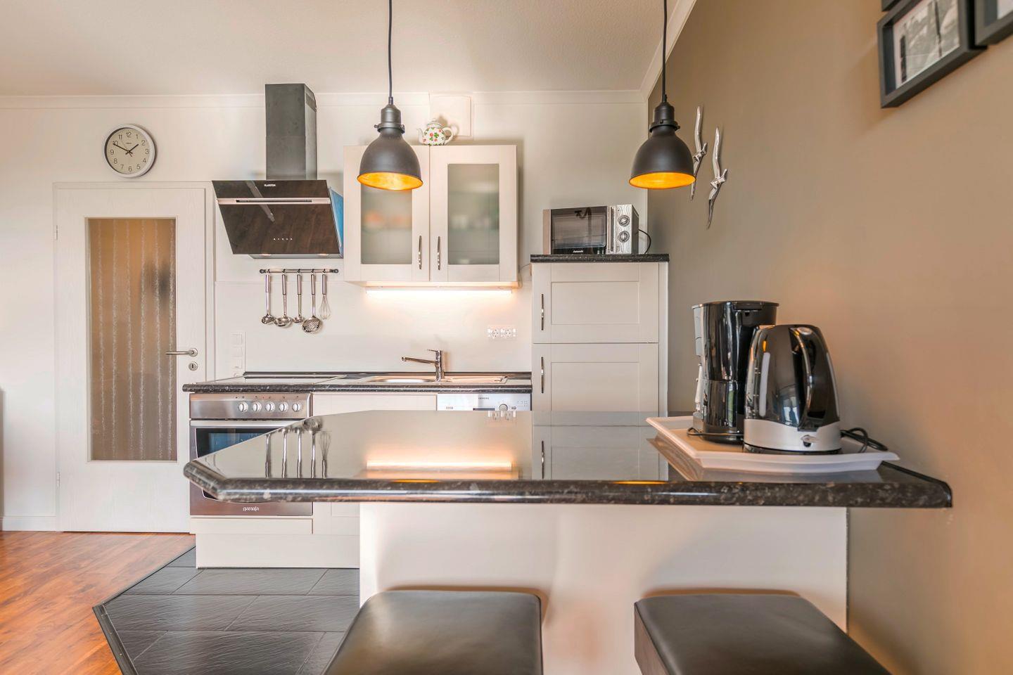 Küchenzeile, Cerankochfeld, Dunstabzugshaube, Backofen, Gefrierschrank, Mikrowelle, Geschirrspüler, Küchentresen mit Barhockern, Kaffeemaschine, Eierkocher, Wasserkocher, Toaster, Espressomaschine