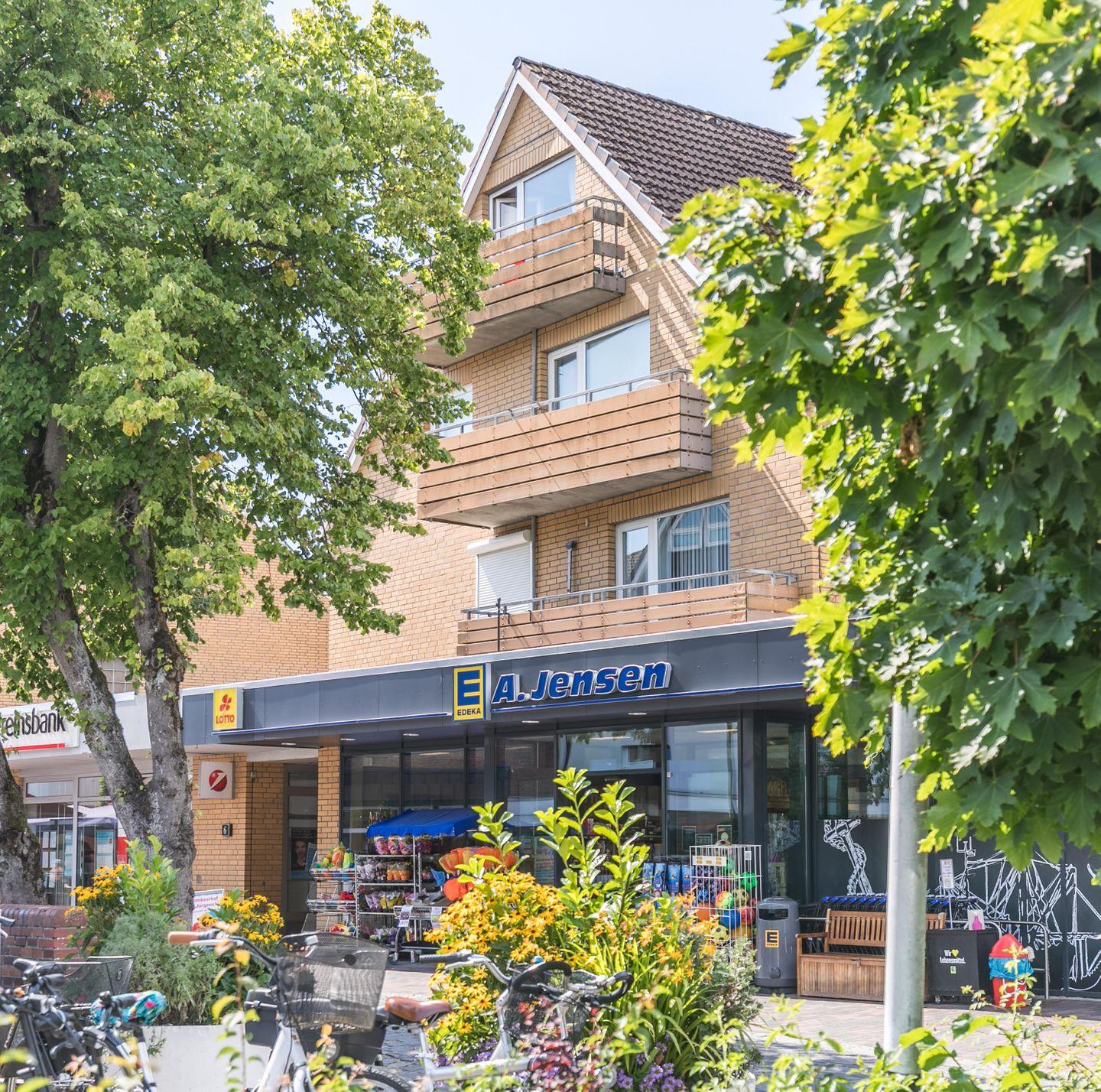 Der EDEKA Jensen Supermarkt und der Nordseebäcker Kruse befinden sich im Erdgeschoss des Gebäudes. Viele Restaurants, der Hafen und der Hauptstrand sind nur ein paar Schritte entfernt. Der Bahnhof liegt fußläufig ca. 500m entfernt.