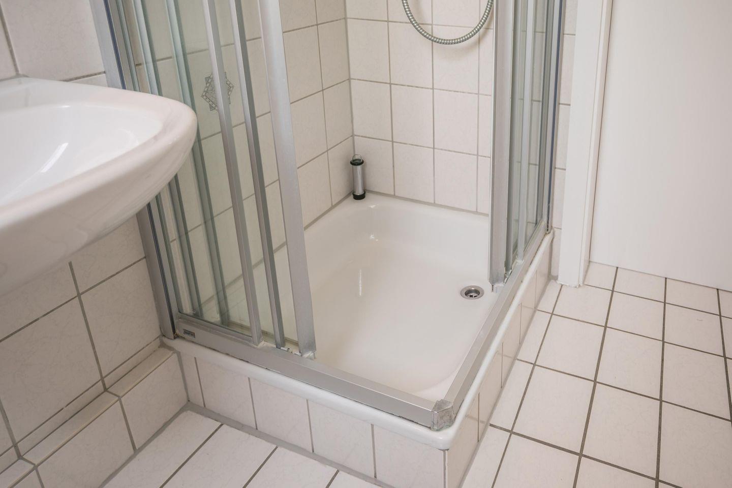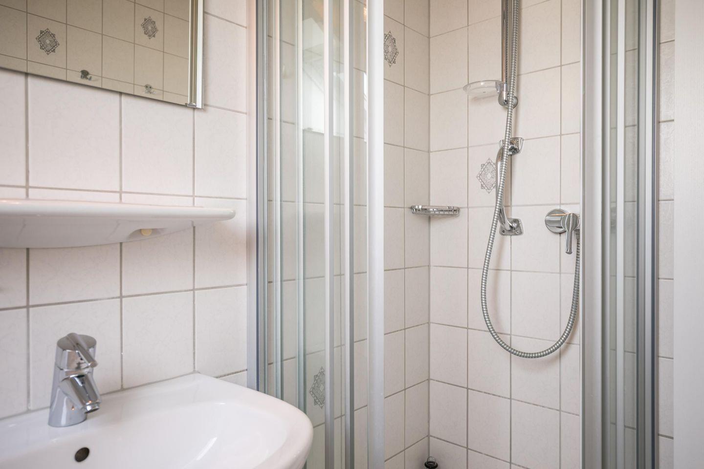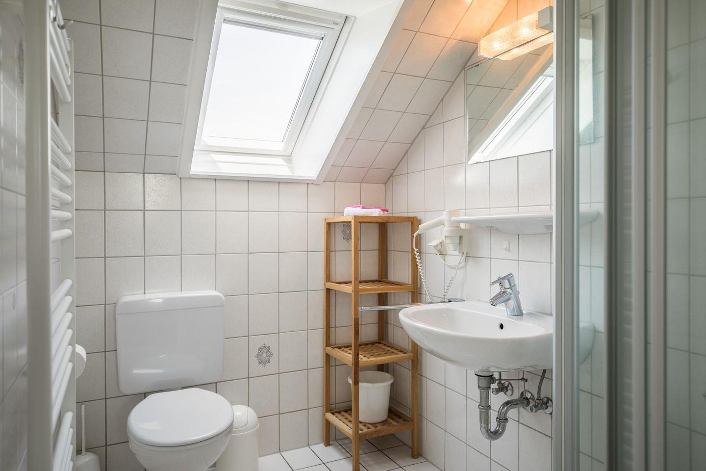 Dusche mit Duschwanne, WC, Waschbecken, Fön, Jalousie, Handtuchheizung