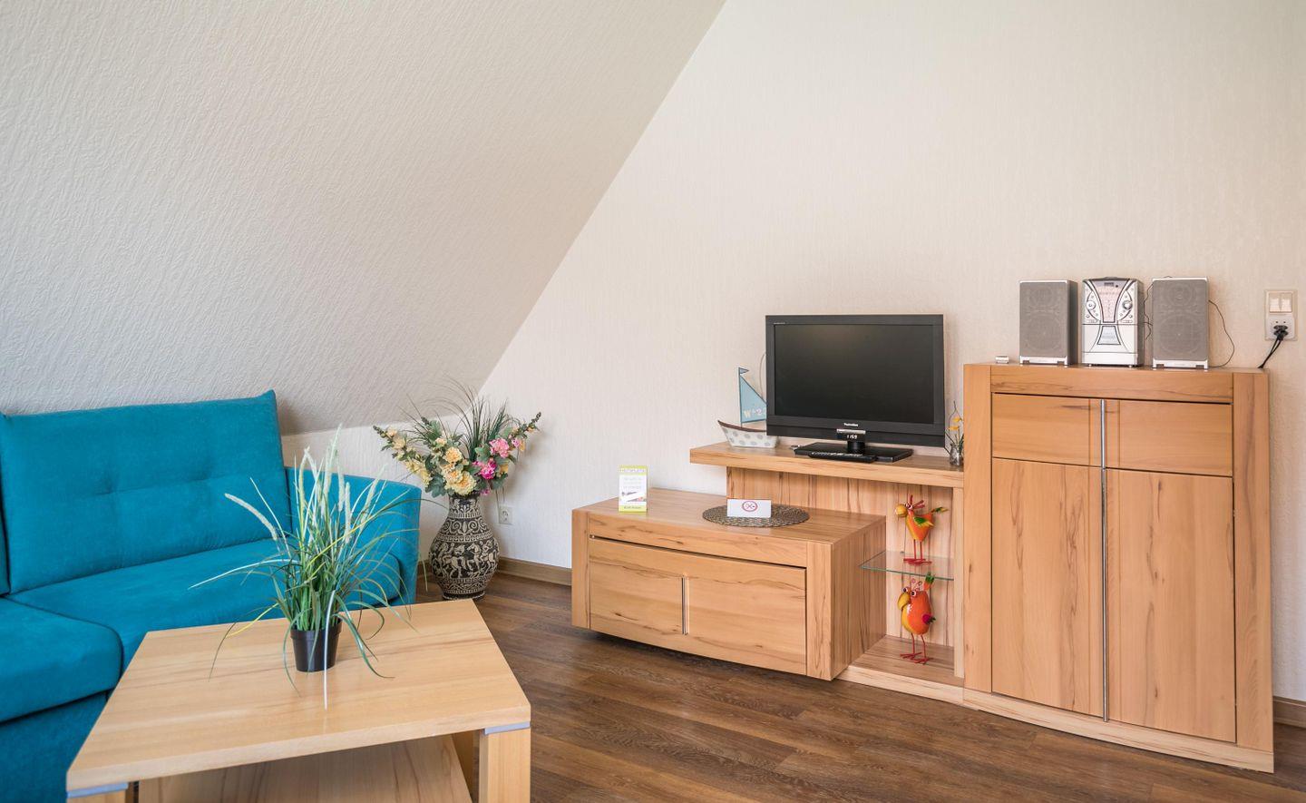 Couchgarnitur, Wohnzimmerschrank, Esstisch mit Stühlen, Flachbild Sat-TV, Balkon, Stereoanlage mit CD-Player, Zugang zum Balkon