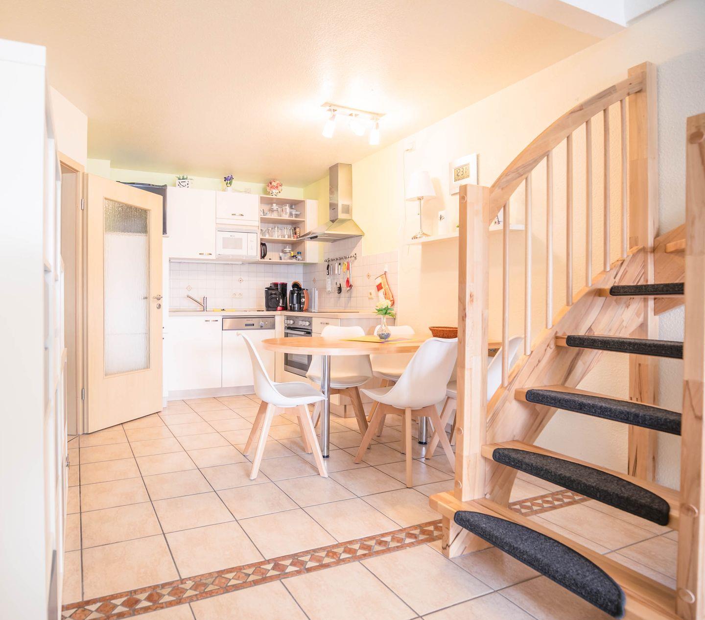 Einbauküche, Geschirrspüler, Herd mit Cerankochfeld, Backofen, Airfryer, Kühlschrank, Kaffeemaschine, Toaster, Wasserkocher, Eierkocher, Gefrierschrank, Essecke mit Tisch und Stühlen