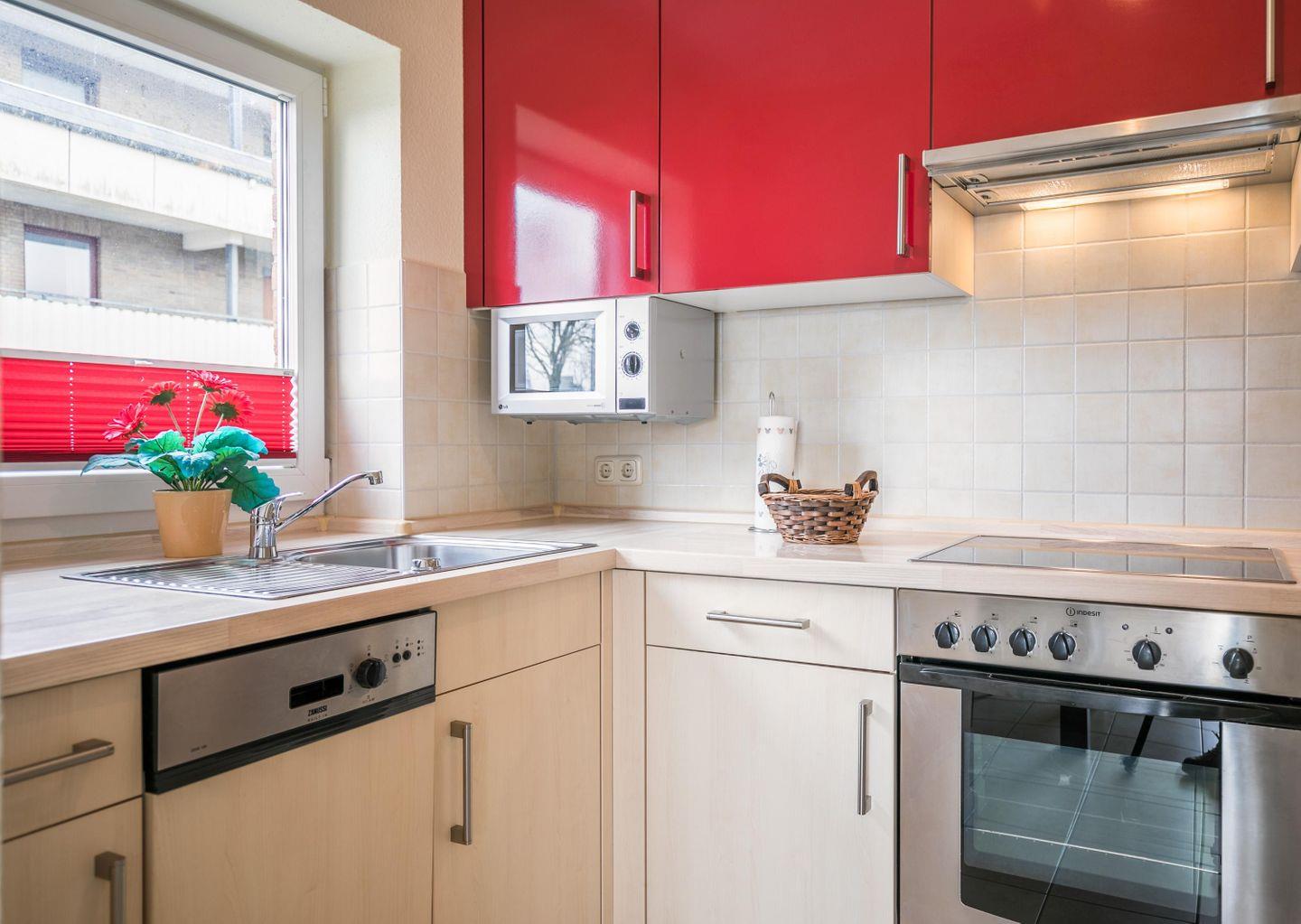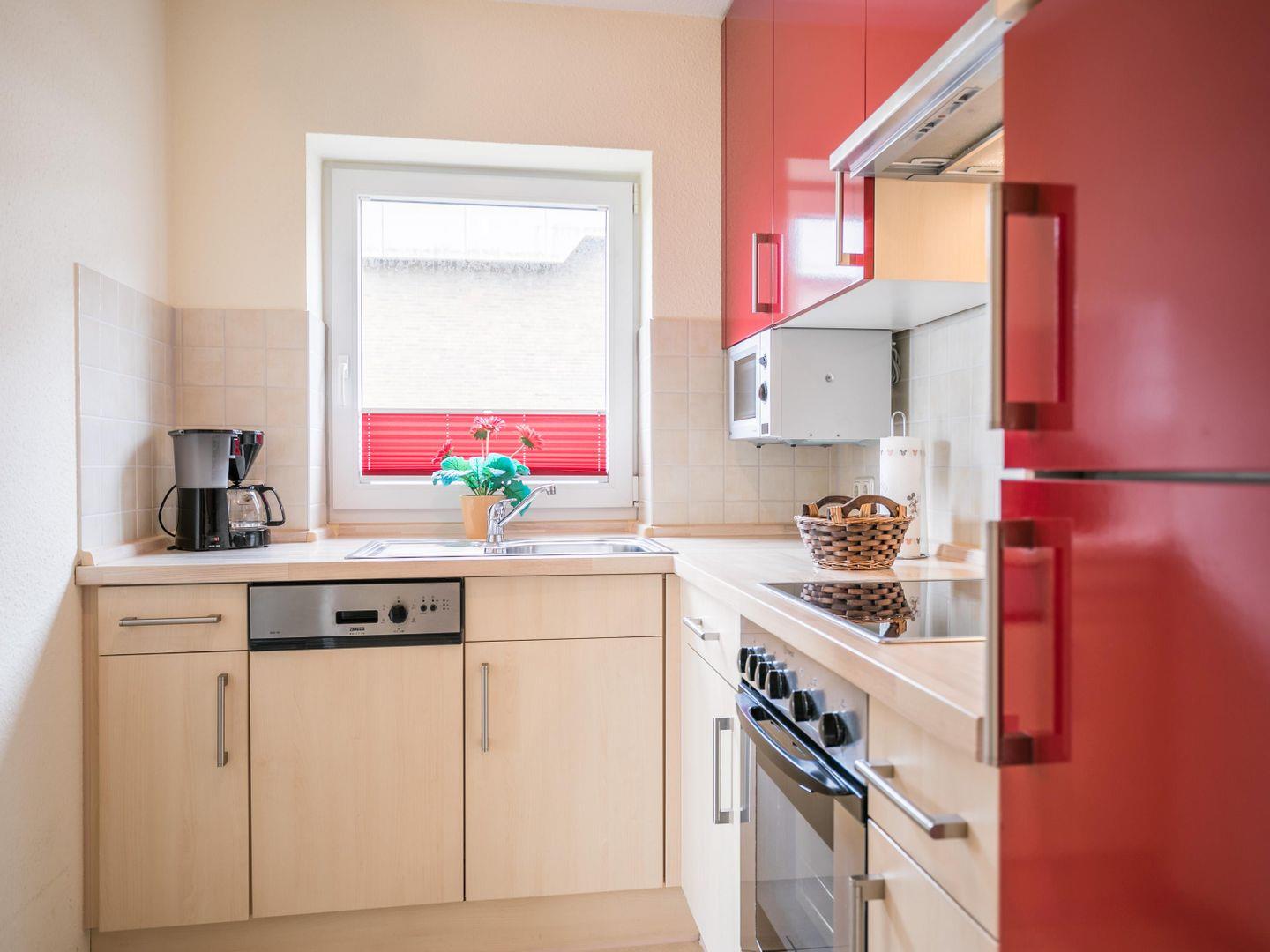 Einbauküche, Geschirrspüler, Ceran-Kochfeld, Abluft, Backofen, Mikrowelle, Kühlschrank, kl. Gefrierschrank, Wasserkocher, Toaster, Kaffeemaschine, Eierkocher