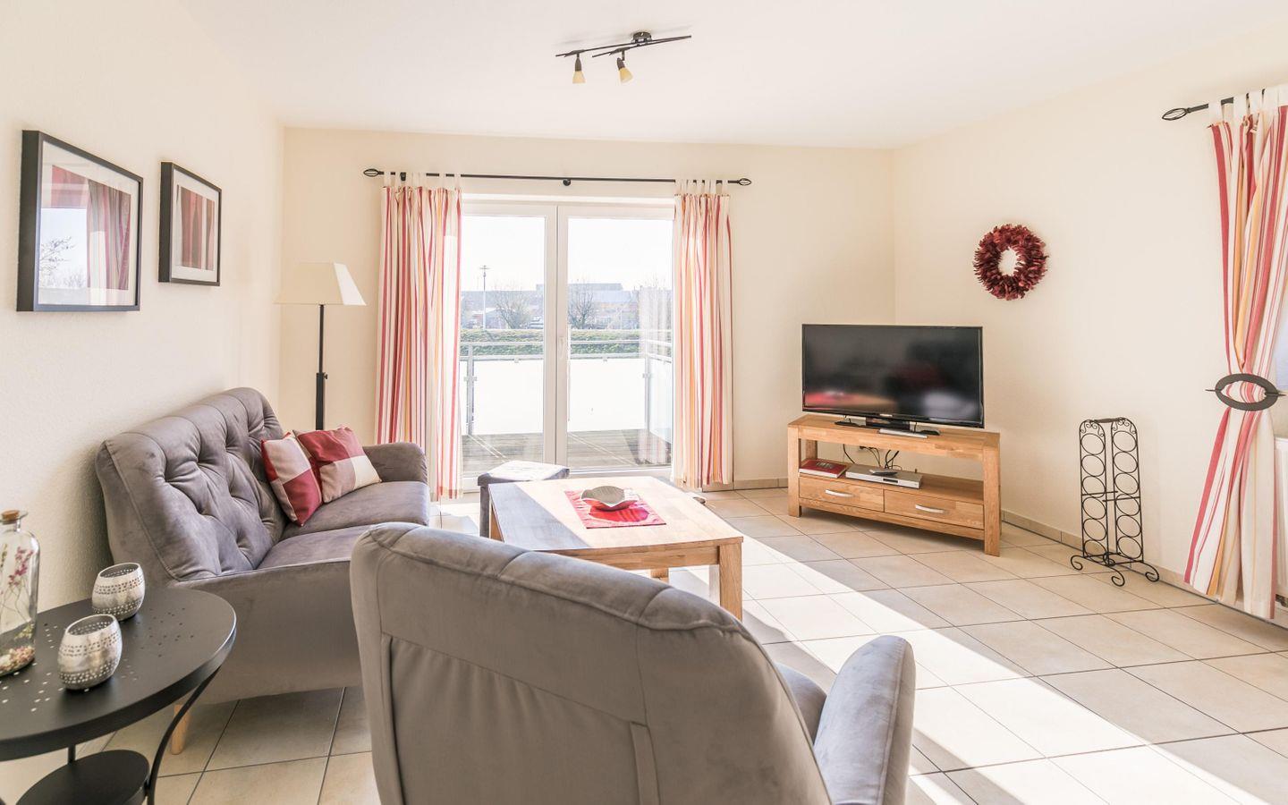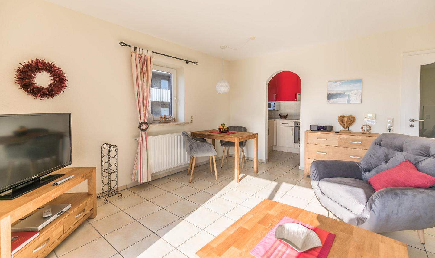 Die Wohnung verfügt über ein separates Schlafzimmer mit Doppelbett und Außenjalousien, ein modernes Duschbad mit Fußbodenheizung und Waschmaschine sowie eine voll ausgestattete Küche inklusive Geschirrspüler, Backofen und Mikrowelle. Im gemütlichen Wohnbereich erwarten Sie eine Couchgarnitur, SAT-TV, Bose Wave System IV und ein Essplatz. Der Südbalkon lädt mit Tisch und Stühlen zum Verweilen ein.