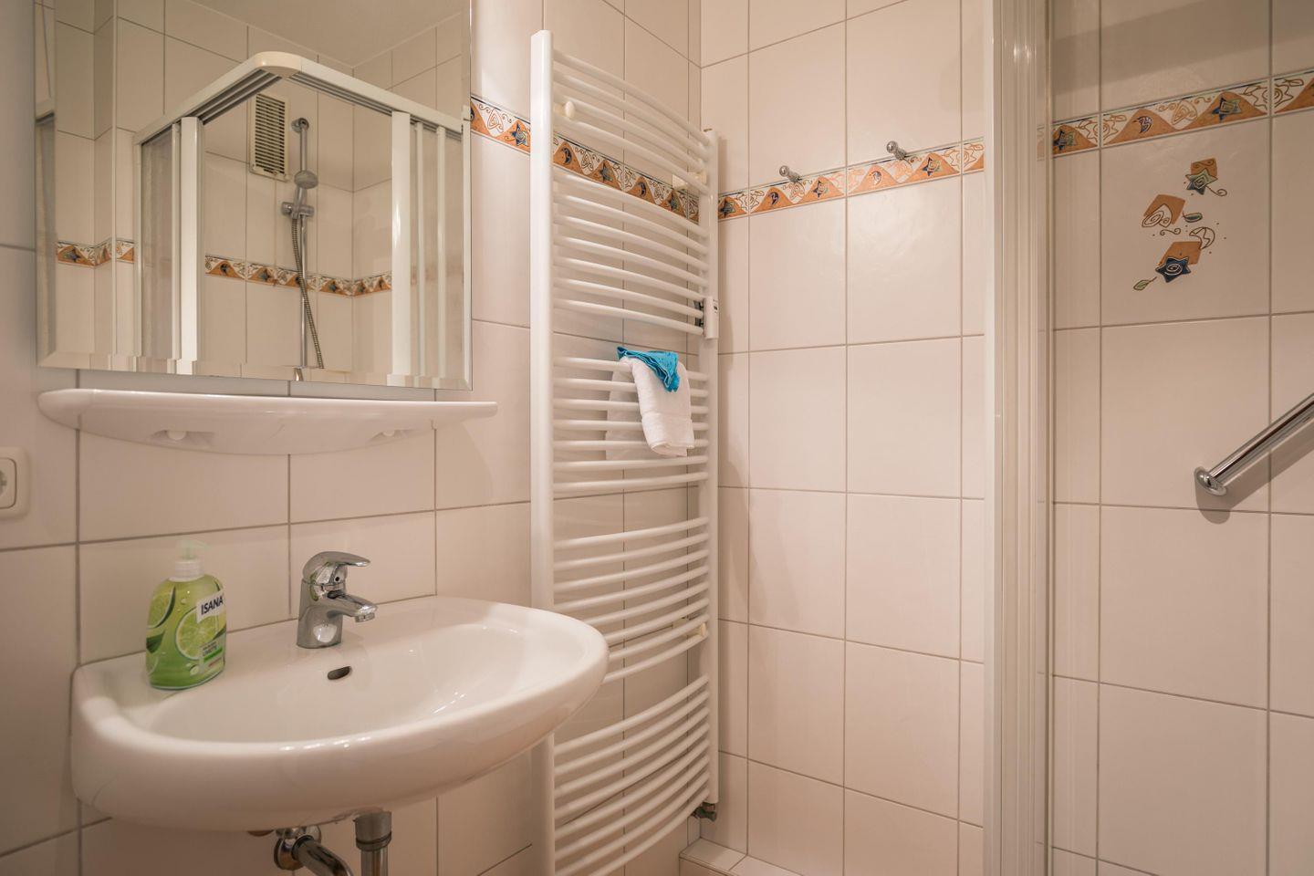Dusche, WC, Waschbecken, Spiegel, Handtuchwärmer, Abluft