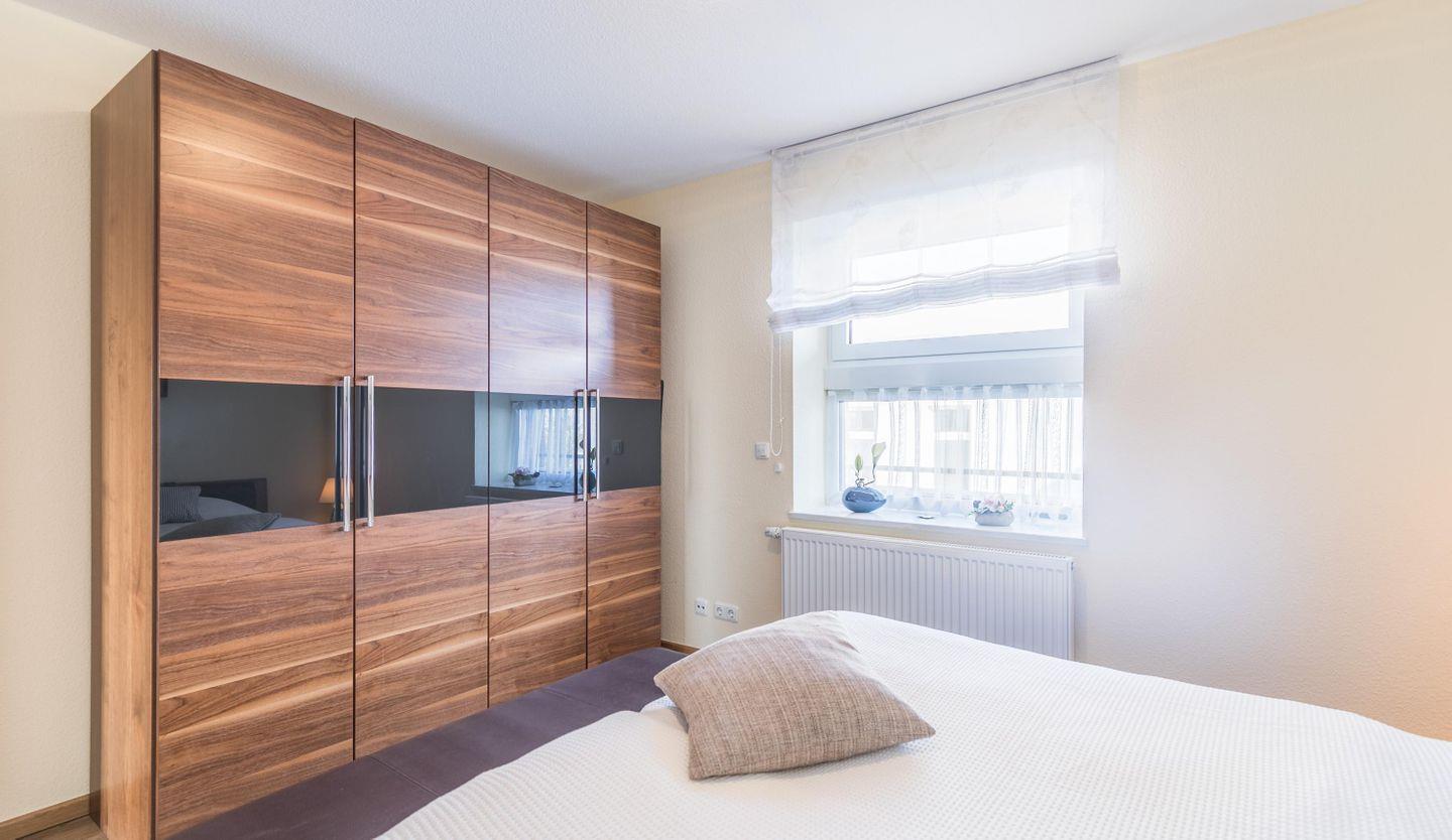 Doppelbett (2,00m x 0,90m x 0,60m) , Kleiderschrank, Hocker, Nachttische, Nachttischlampen mit Touchfunktion, Sitzbank, CD/Radiowecker, elektr. Aussenrolladen