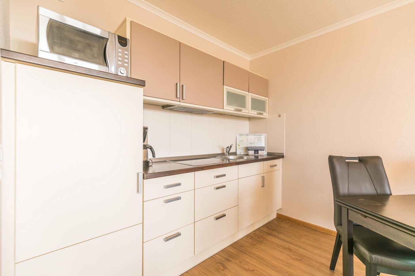 Einbauküchenzeile, Geschirrspüler, Kaffeemaschine, Toaster, Wasserkocher, Mikrowelle mit Grillunktion und Konvektion, Kühlschrank mit Gefrierfach, Geschirr, Töpfe
