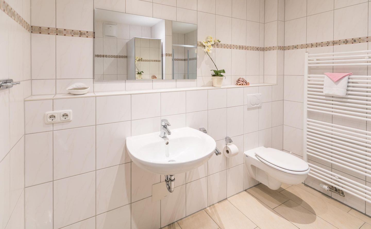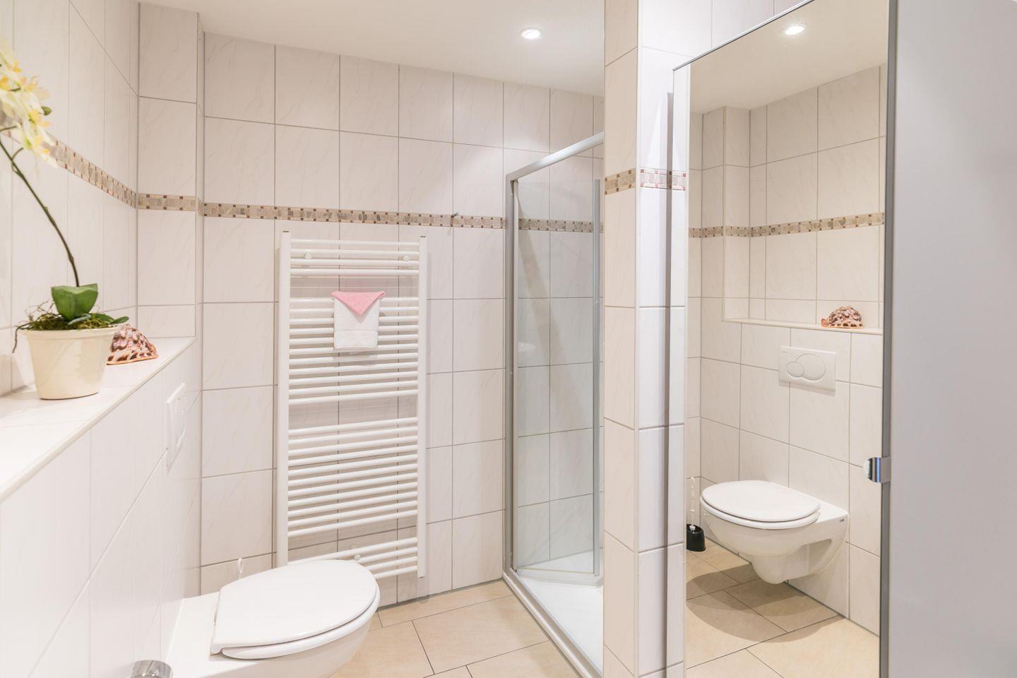 Dusche mit flacher Duschwanne, WC, Fön, Fußbodenheizung, Handtuchwärmer, Ganzkörperspiegel, Hocker