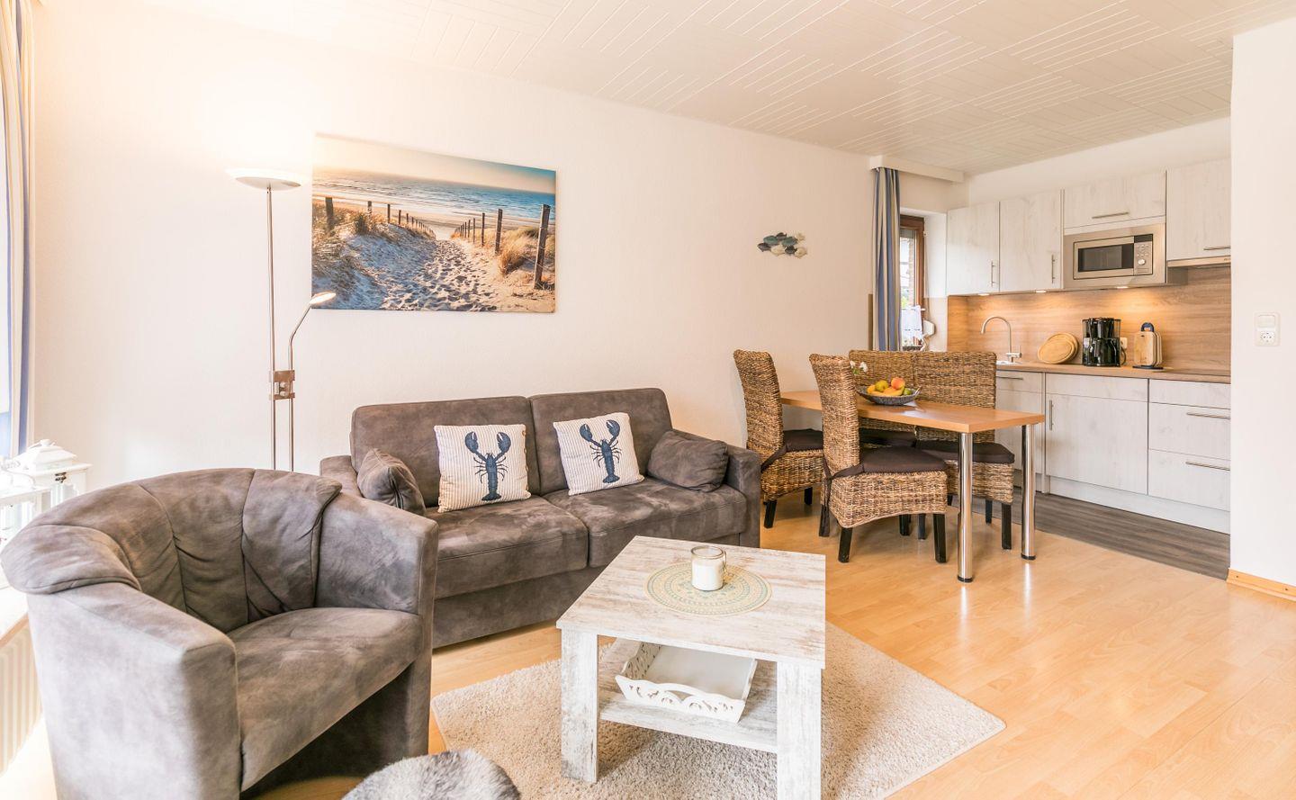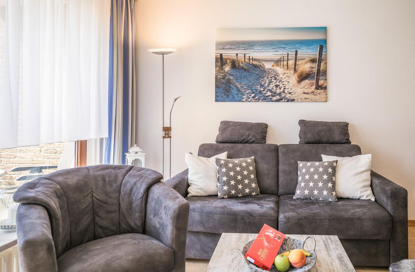 Helle und moderne Farben sorgen für ein behagliches Wohnklima! Das neue Komfort-Schlafsofa ermöglicht es Ihnen diese Ferienwohnung ab sofort mit bis zu 3 Personen zu buchen. Ein hell gestaltetes Bad mit Fenster ist ebenso wie ein gemütliches Doppelbett im Schlafzimmer vorhanden. Um vom Parkplatz zum Haus Schloss am Meer zu gelangen müssen Sie ein paar Stufen steigen.