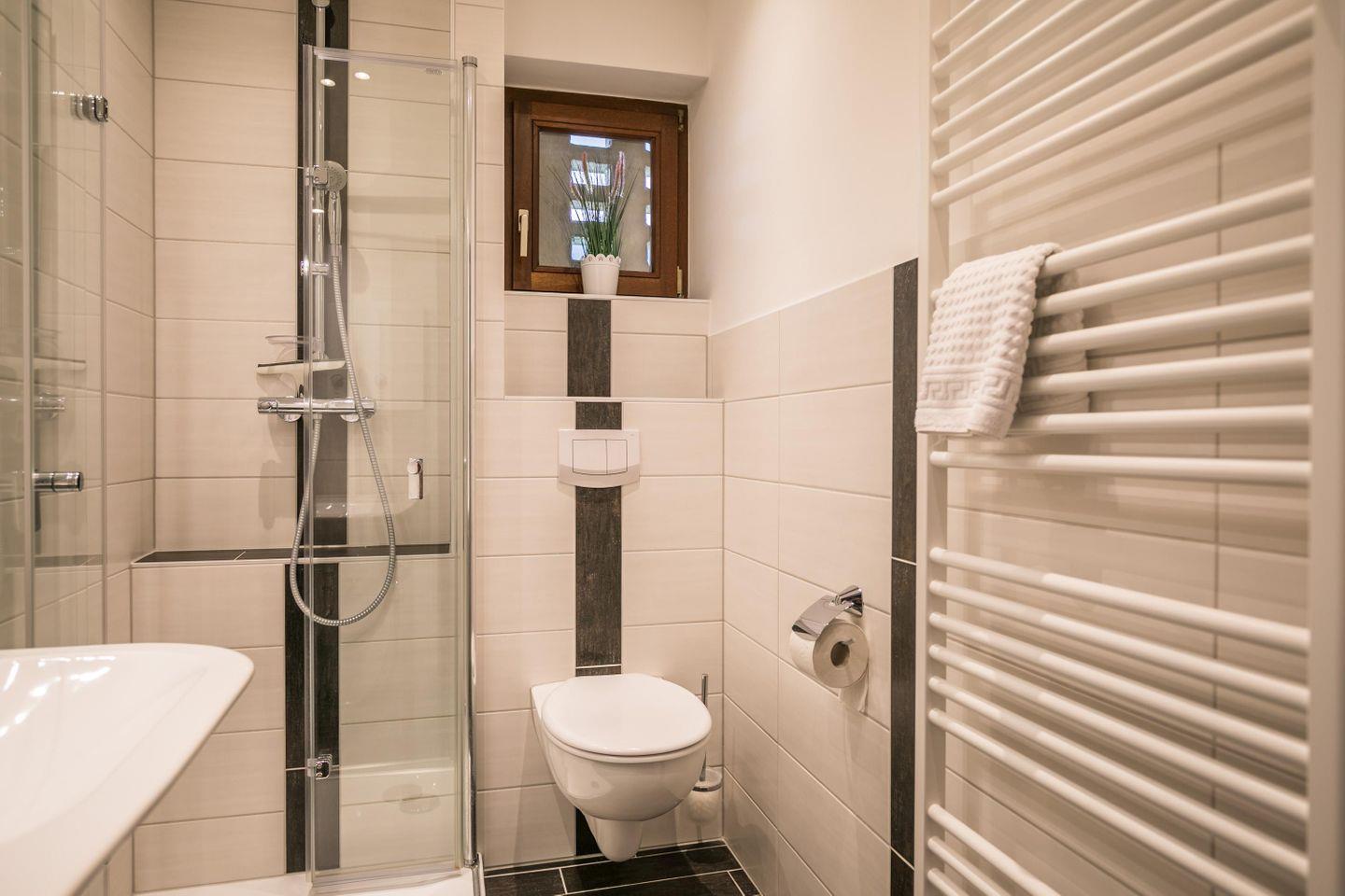 Dusche, WC, Spiegel, Handtuchtrockner, Fenster, Föhn