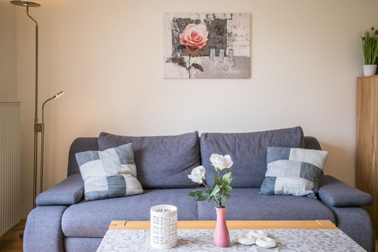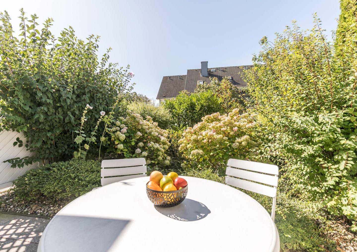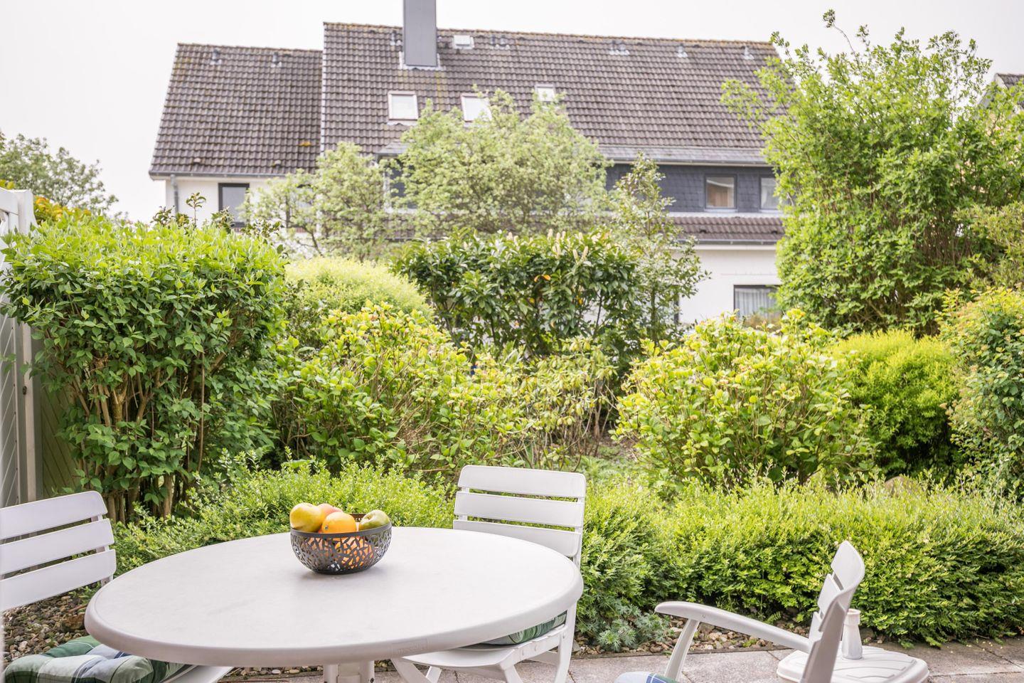 W-LAN, ruhige Südterrasse, Gartenmöbel, Sonnenschirm, 1 Gartenliege, Abstellraum, keine Haustiere, Nichtraucherwohnung, Wäsche optional dazu buchbar, kostenfreier Privatparkplatz