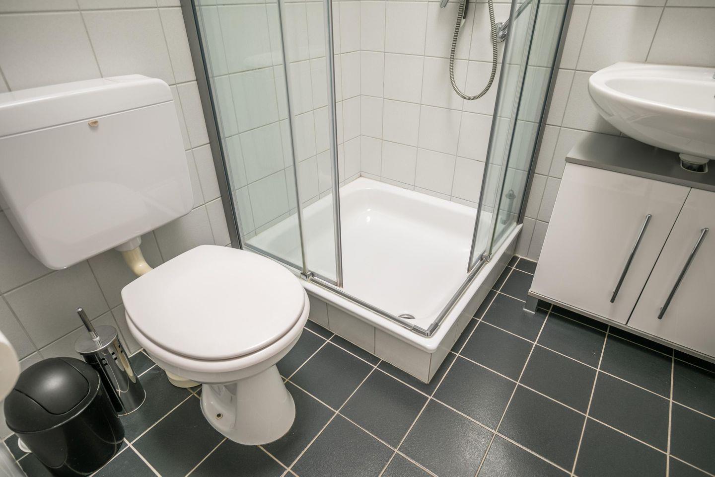Duschbad mit Glasabtrennung, WC, Waschtisch mit großem Spiegel, Hängeschrank, Fön, Oberlicht elektr. zu öffnen