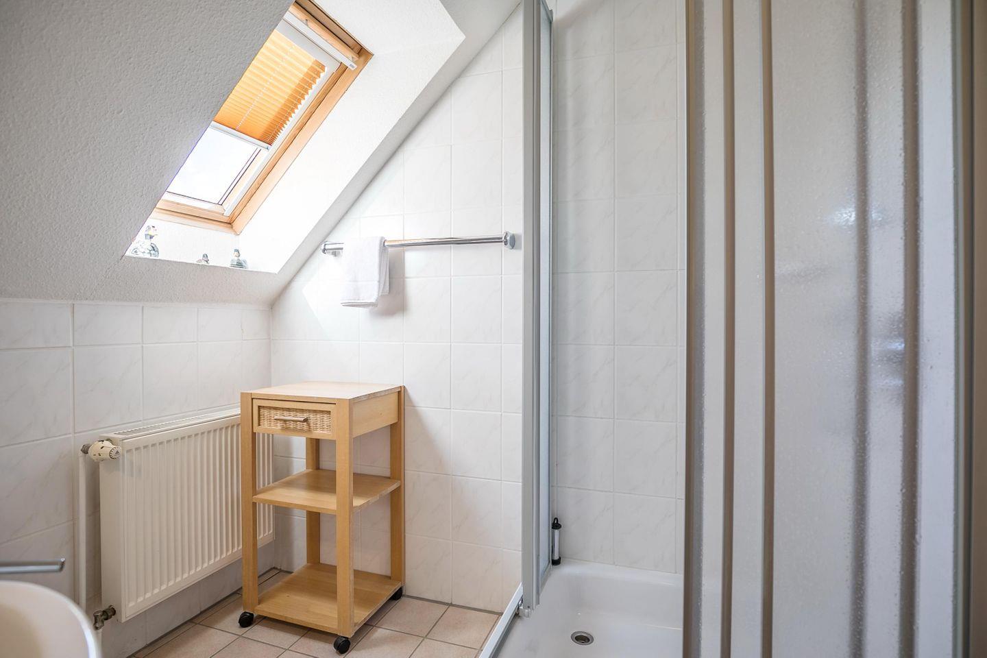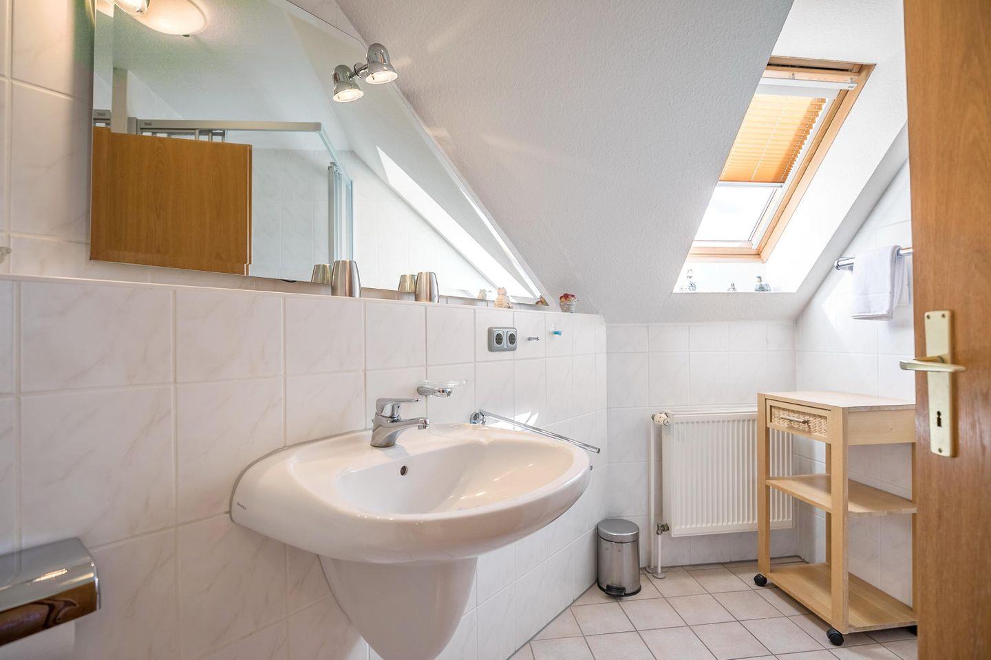 Dusche, WC, Waschbecken, Spiegel, Stuhl, Föhn, Fenster mit Plissee