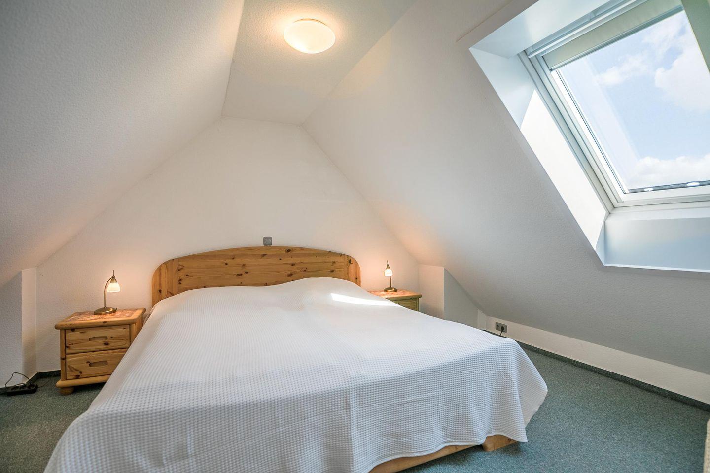 offenes Galerieschlafzimmer, Doppelbett mit getrennten Matratzen (à 200cm x90cm), verstellbarer Lattenrost Kopf- und Fußteil, 2 Korbstühle, Dachfenster mit Verdunkelungsrollo, Teppichboden